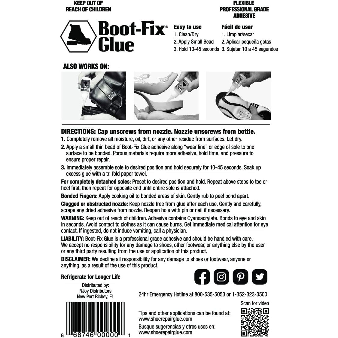 Boot-Fix is a super glue (cyanoacrylate) that is specifically formulated for the shoe repair industry. We know because we’ve been using this type of glue in our shoe repair shops for almost 30 years now and we think we’ve found the best formula yet! Boot-Fix Glue is the strongest footwear adhesive that works on all different types of shoe materials. What makes Boot-Fix Glue different from your average super glue? Boot-Fix remains flexible after it dries so it doesn’t just break apart again when the footwear is worn. Also, it’s viscosity has been specifically formulated to bond to the types of materials used to manufacture footwear these days. Unlike other shoe glues, Boot-Fix doesn’t require clamping for most repairs. It’s ready to go in minutes, not hour or even days. Boot-Fix Glue is completely waterproof and it’s designed to hold even in the blistering summer heat, or icy cold of winter. Whether you need to glue your boots for a hard day's work, a tough day of training, or just a walking around the office, Boot-Fix Glue can repair your work boots, athletic sneakers, rubber soled dress shoes, and much more!. As my dad used to say “If the shoe fits, Glue It!”