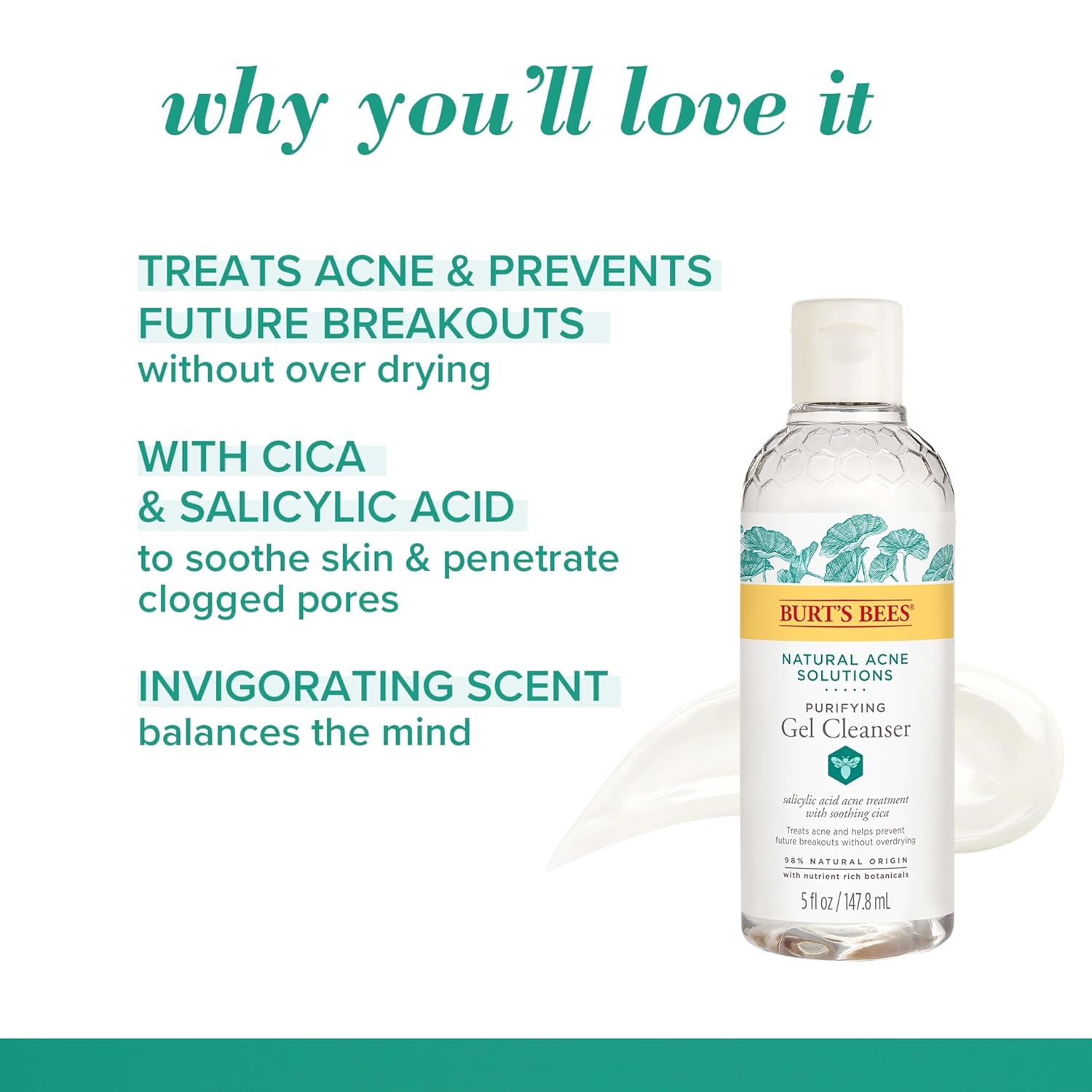 Product Description Soothe acne prone skin with Burts Bees Natural Acne Solutions Purifying Gel Cleanser. With a formula that features soothing Cica, this acne cleanser helps wash away acne causing bacteria, excess oil and impurities without over-drying or irritating skin. This acne face cleanser contains salicylic acid, derived naturally from willow bark, to penetrate clogged pores, reduce acne and help prevent future breakouts. Soothing Cica is tough on acne but gentle on skin, while evening primrose and beet root extracts work together in this 98% natural origin formula to help soothe acne prone skin. With regular use, youre left with skin that looks and feels clean, balanced and healthy. Formulated without parabens, phthalates, petrolatum or SLS. For best results, target acne with the entire line of Burts Bees Natural Acne Solutions. Give your skin the best nature has to offer with Burts Bees, a leader in natural skin care. Brand Story By
