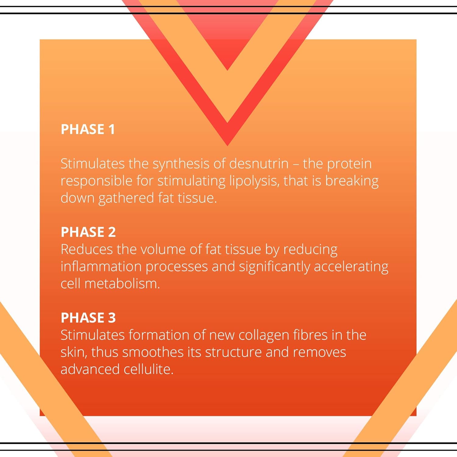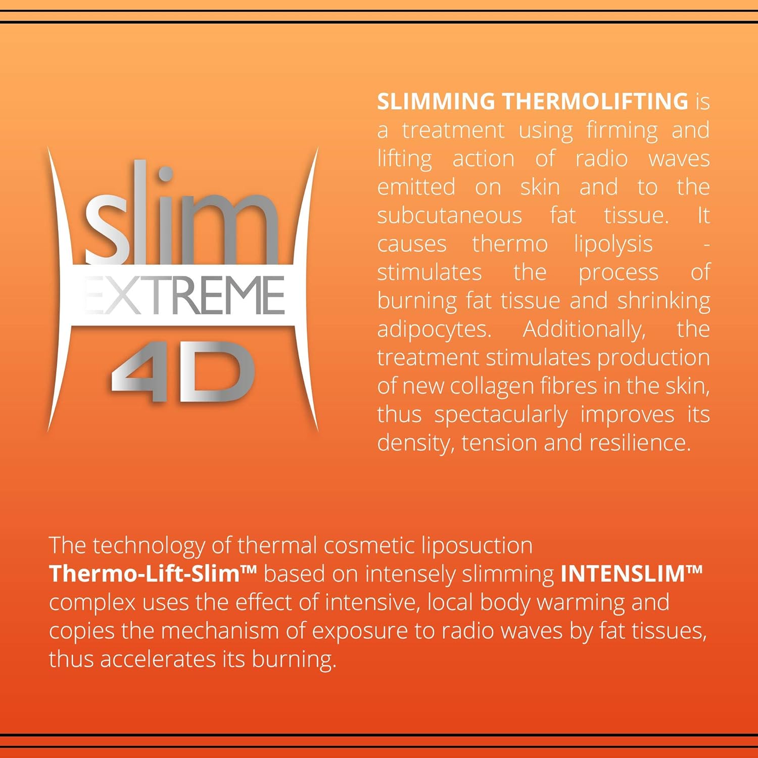 THERMAL COSMETIC LIPOSUCTION TECHNOLOGY SLIMMING THERMOLIFTING is a treatment using firming and lifting action of radio waves emitted on skin and to the subcutaneous fat tissue. It causes thermo lipolysis - stimulates the process of burning fat tissue and shrinking adipocytes. Additionally, the treatment stimulates production of new collagen fibers in the skin, thus spectacularly improves its density, tension and resilience. The technology of thermal cosmetic liposuction Thermo-Lift-Slim based on intensely slimming INTENSLIM complex uses the effect of intensive, local body warming and copies the mechanism of exposure to radio waves by fat tissues, thus accelerates its burning. PHASE 1 Stimulates the synthesis of desnutrin - the protein responsible for stimulating lipolysis, that is breaking down gathered fat tissue. PHASE 2 Reduces the volume of fat tissue by reducing inflammation processes and significantly accelerating cell metabolism. PHASE 3 Stimulates formation of new collagen fibers in the skin, thus smoothes its structure and removes advanced cellulite.