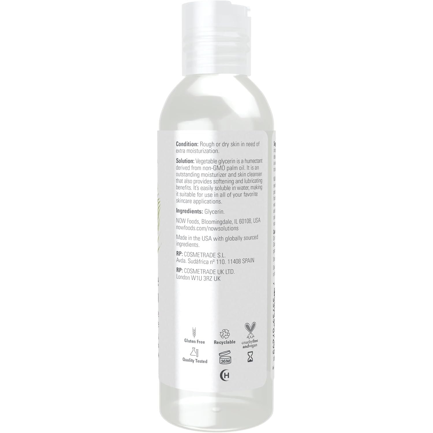 Product Description Pure Versatile Skin Care Softens & Moisturizes Multi-Purpose Condition: Rough or dry skin in need of extra moisturization. Solution: Vegetable glycerin is a humectant derived from non-GMO palm oil. It is an outstanding moisturizer and skin cleanser that also provides softening and lubricating benefits. It’s easily soluble in water, making it suitable for use in all of your favorite skincare applications. Ingredients: Glycerin. Due to the nature of this oil, cloudiness or particles may sometimes appear. NOW® Solutions products are analytically tested to assure the highest quality. NOW® Solutions products are not tested on animals. Made in the USA with globally sourced ingredients. Clear bottle contains UV light protectant. Brand Story By NOW Foods