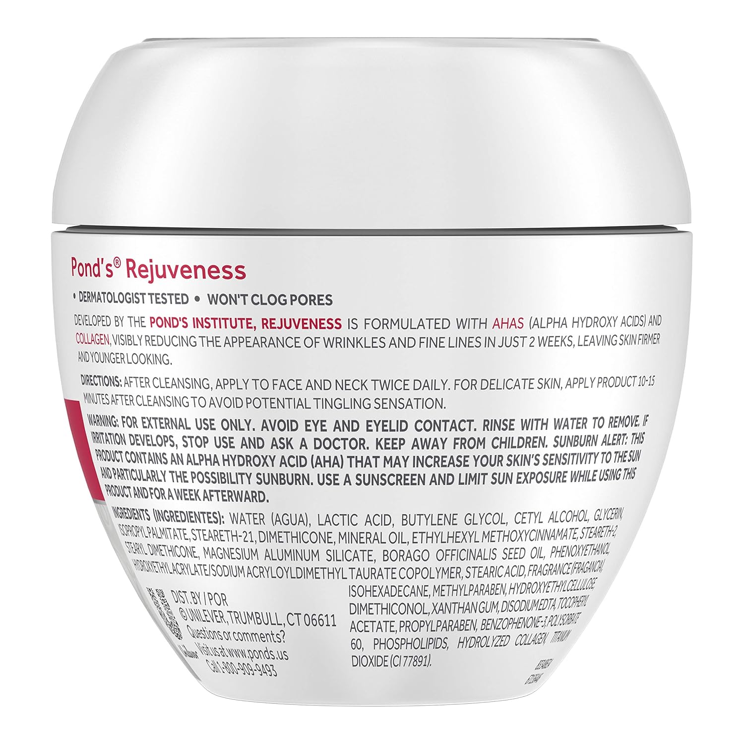 Visibly reduce the appearance of fine lines in two weeks. The first signs of aging become apparent when fine lines and wrinkles start showing on your face. Experts have proven that you can lessen their appearance, by using products formulated with key ingredients known to minimize signs of aging. Whether you are starting early as a preventative measure, or trying to fight the already visible signs of aging, it is important to find a product that nourishes your skin and infuses it with effective anti-aging ingredients. Pond's Rejuveness, is an Anti-Aging Cream that visibly reduces the appearance of fine lines in two weeks. Infuses skin with essential moisture, Pond's Rejuveness is suitable for daily use. The formula contains essential ingredients such as: Formulated with Alpha Hydroxy Acids (AHAs), which are known to gently remove dull surface skin cells and smooth the appearance of fine lines. Made with Collagen, a fiber known to increase skins strength, elasticity, and to improve the healthy appearance of skin. Infused with Vitamin E, an antioxidant that is known to moisturize and maintain the healthy appearance of skin. One Rejuveness jar is sold every 10 seconds! See why women across America trust Pond's Rejuveness for visible anti-aging results!