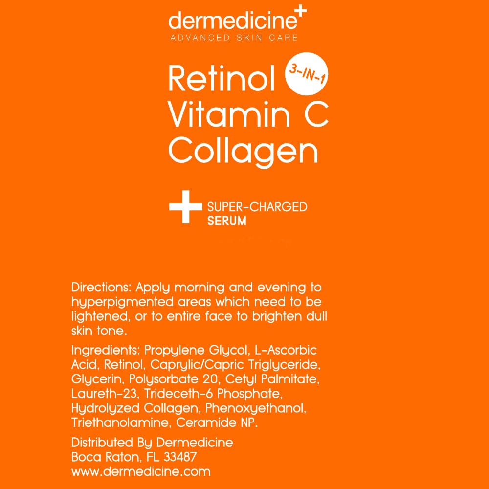 Our 3 in 1 serum works to help your complexion appear more even, youthful and bright while helping to fade the appearance of fine lines and wrinkles, blotchiness and unevenness that becomes more apparent as we age. It is suitable for all skin types and tones including normal, sensitive, mature, older, fair to darker skin tones such as African-American, Asian, Latin, Indian and Mediterranean. To use, wash face using a cleanser and pat dry. Avoiding direct eye contact, apply a thin layer of serum to hyperpigmented areas which need to be lightened, or to entire face to brighten dull skin tone and allow to dry. Apply twice daily (AM / PM). During daylight hours, apply a broad spectrum sunscreen after serum. Can be worn under moisturizer and makeup. Caution: Discontinue use if redness or irritation occurs. Do not ingest. Ingredients: Propylene Glycol, L-Ascorbic Acid, Retinol, Caprylic/Capric Triglyceride, Glycerin, Polysorbate 20, Cetyl Palmitate, Laureth-23, Trideceth-6 Phosphate, Hydrolyzed Collagen, Phenoxyethanol, Triethanolamine, Ceramide NP. MADE IN THE USA