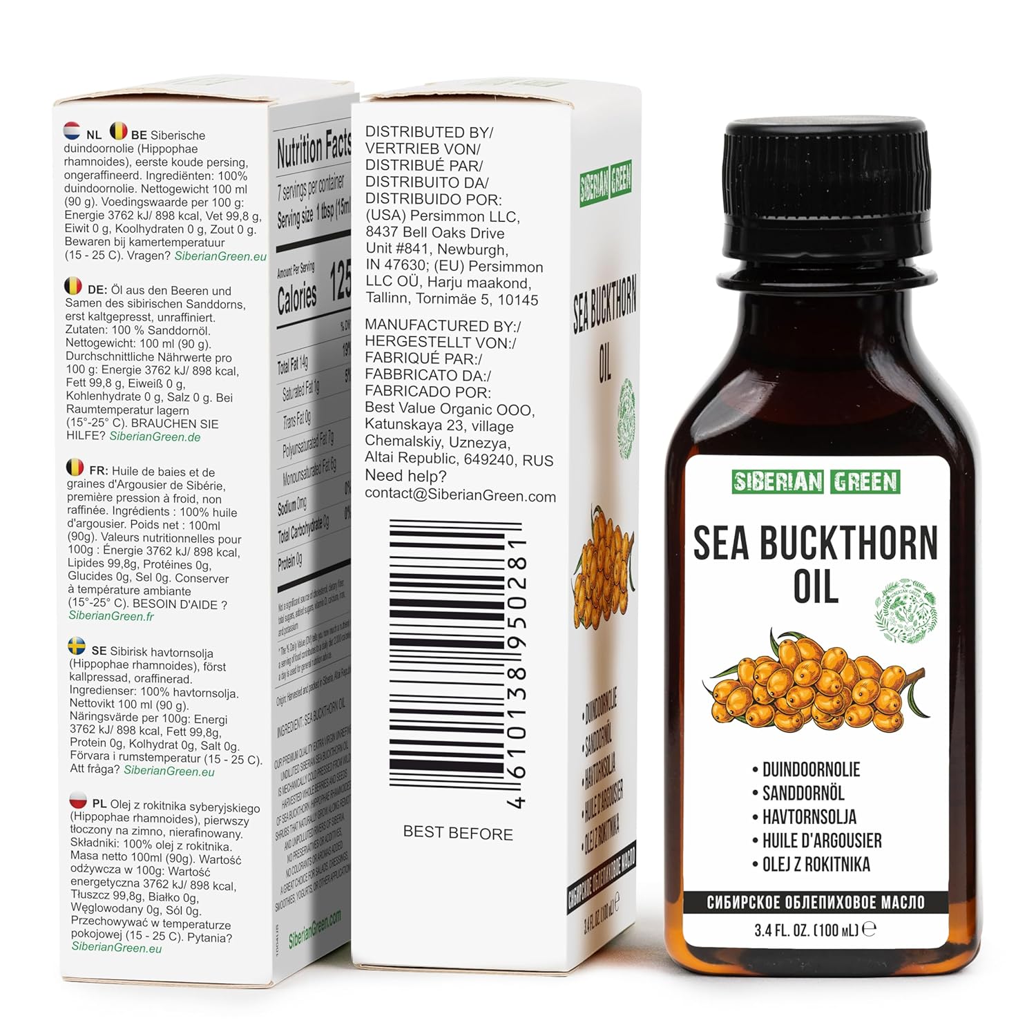 Siberian Sea Buckthorn Oil | 100% Natural Extra Virgin Cold Pressed 100 ml / 3.4 fl oz | Unrefined Raw Vegan | Exclusive Healthy Diet Food Grade