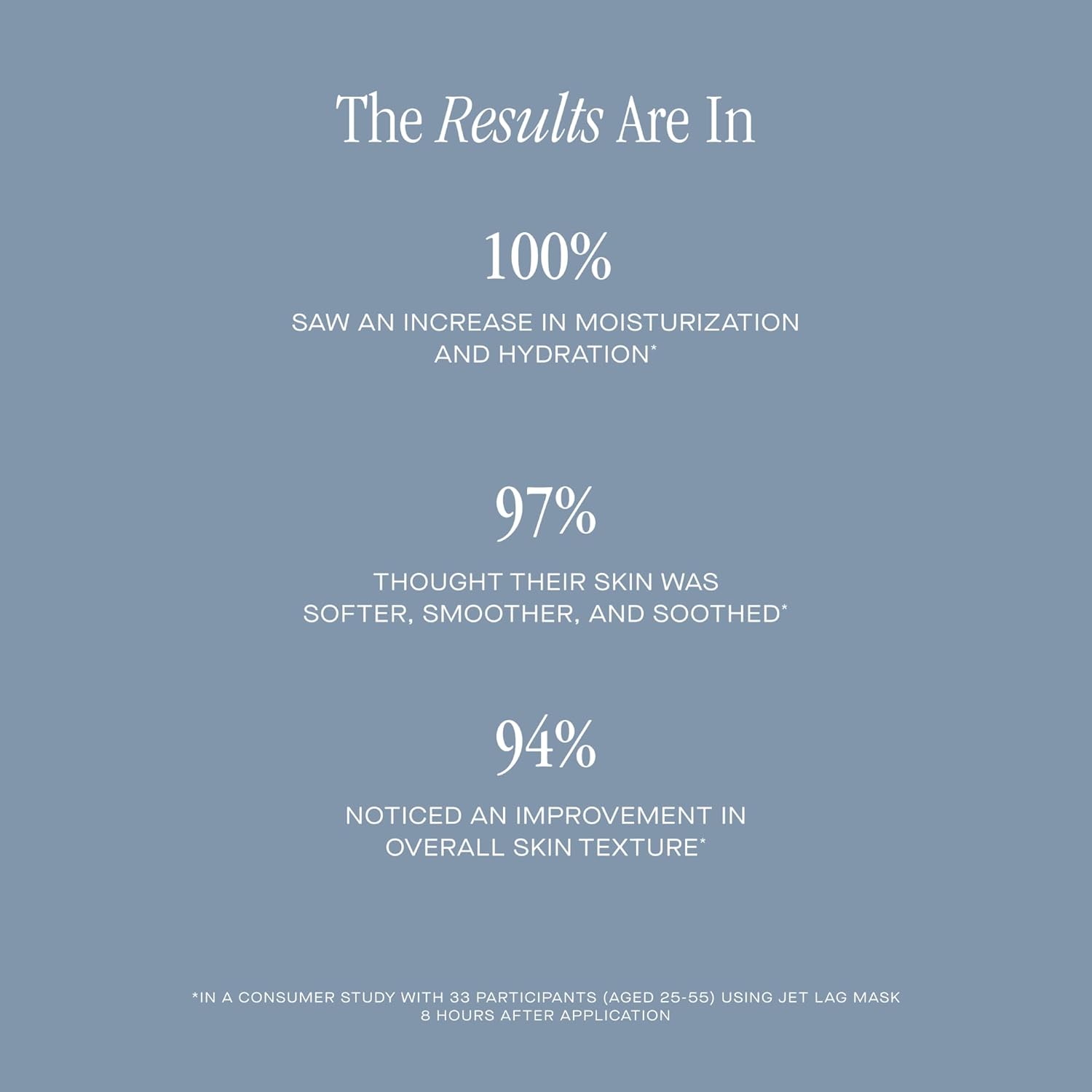 - The Results Are In - In a consumer study with 33 participants aged 25-55, 100% of participants saw an increase in moisturization and hydration 8 hours after application of Jet Lag Mask.*
