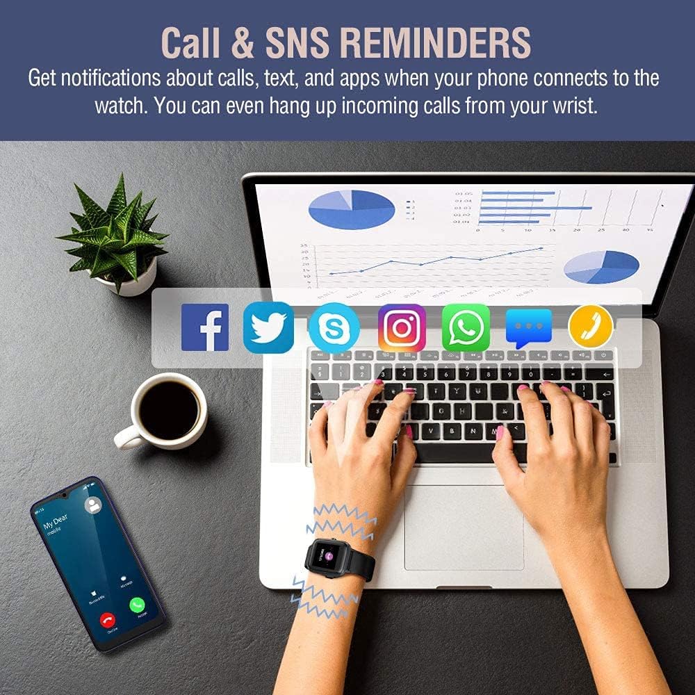 - ⌚【Your Personal Smart Assistant】Activity tracker (pedometer, calories, distance), heart rate, blood oxygen, 20+ Sports Mode, sleep monitoring.,etc. Get notifications of Call, SMS, and APP messages(THE WATCH CAN NOT MAKE MESSAGES, CALLS or TEXT BACK, Bluetooth distance 8-10 meters), remote control of music and cameras, sedentary reminder, alarm clock, stopwatch, find phone, call rejection, brightness adjustment, power-saving mode, and other functions to meet your daily needs.
