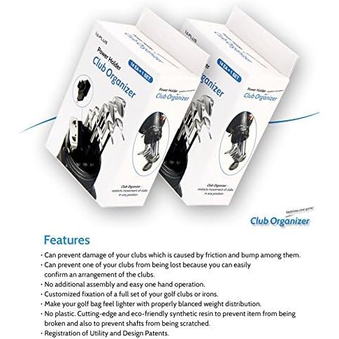 * Can prevent damage of your clubs which is caused by friction and bump among them. * Can prevent one of your clubs from being lost because you can easily confirm an arrangement of the clubs. * No additional assembly and easy one hand operation. * Customized fixation of a full set of your golf clubs or irons. * Make your golf bag feel lighter with properly balanced weight distribution. * No plastic. Cutting-edge and eco-friendly synthetic resin to prevent item from being broken and also to prevent shafts from being scratched. * Registration of Utility and Design Patents.