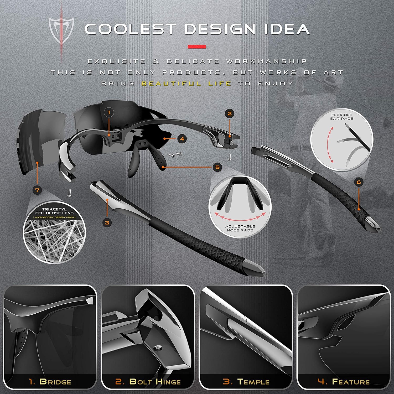 - Skidproof Design Temple:It make by ultra-light silicone material,Soft, can be bent greatly. The leg covers is inspired by the texture of golf, which make this Polarized Sports Sunglasses stronger sense of contact, better comfort, not easy to slip.