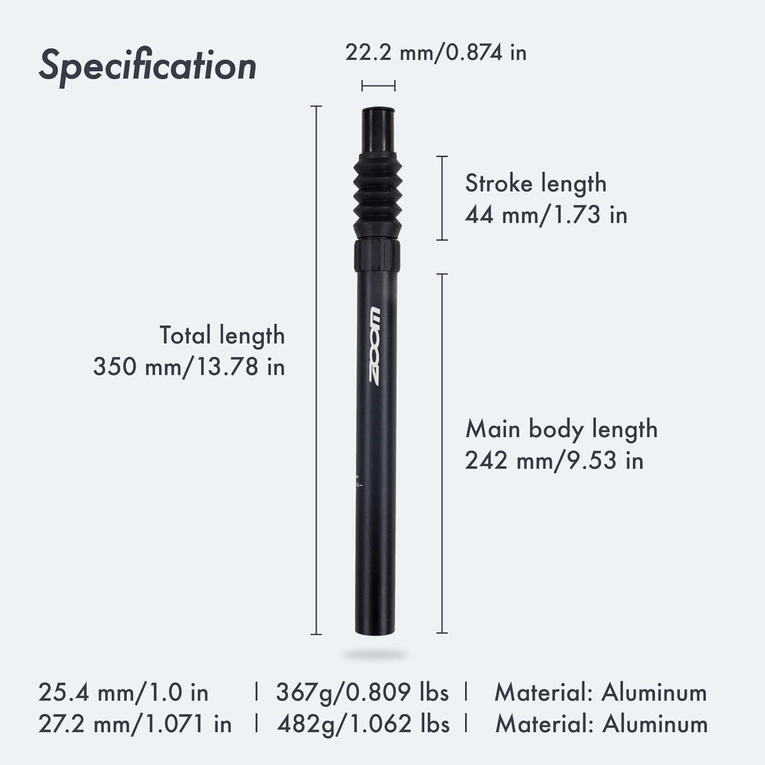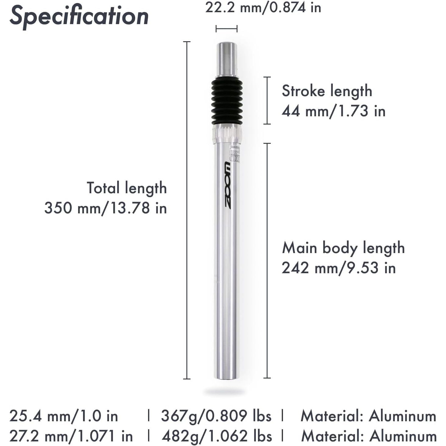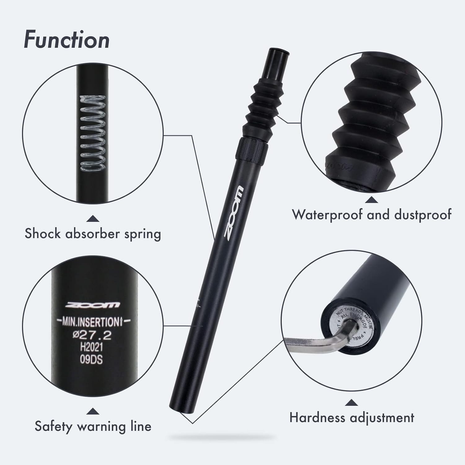 - Spring Suspension: Equipped with a spring coil and damper rubber inside to absorb shocks and enhance your riding comfort. Offers a shock absorb travel of 40mm (1.73 inches) with a total seatpost length of 350mm (13.7 inches).