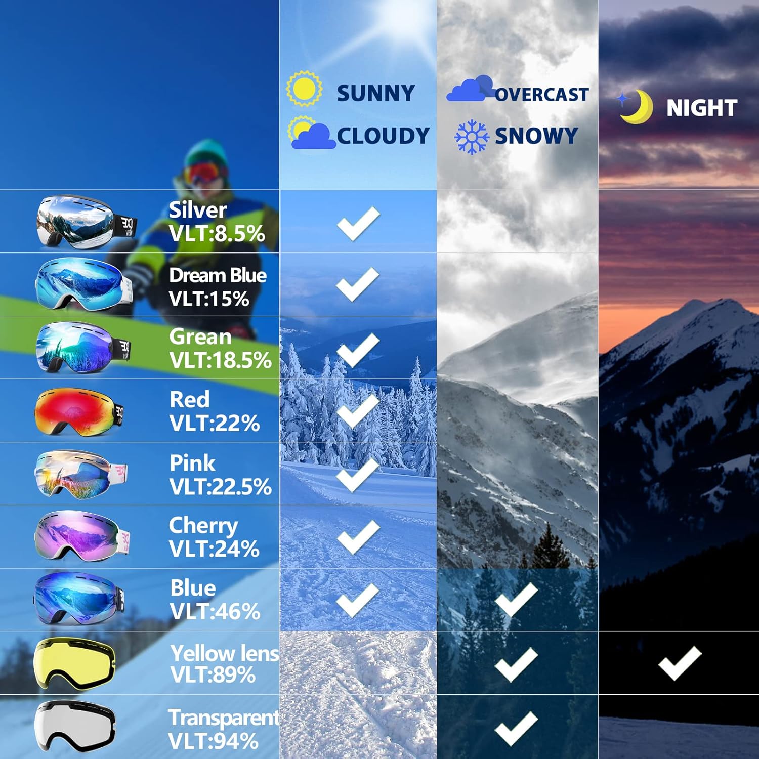 - Anti-fog System: The Snowboarding Goggles is made of dual lenses and all lenses anti fog coating. The Vents supply a excellent vent channels enhance air flowing and prevent fogging.
