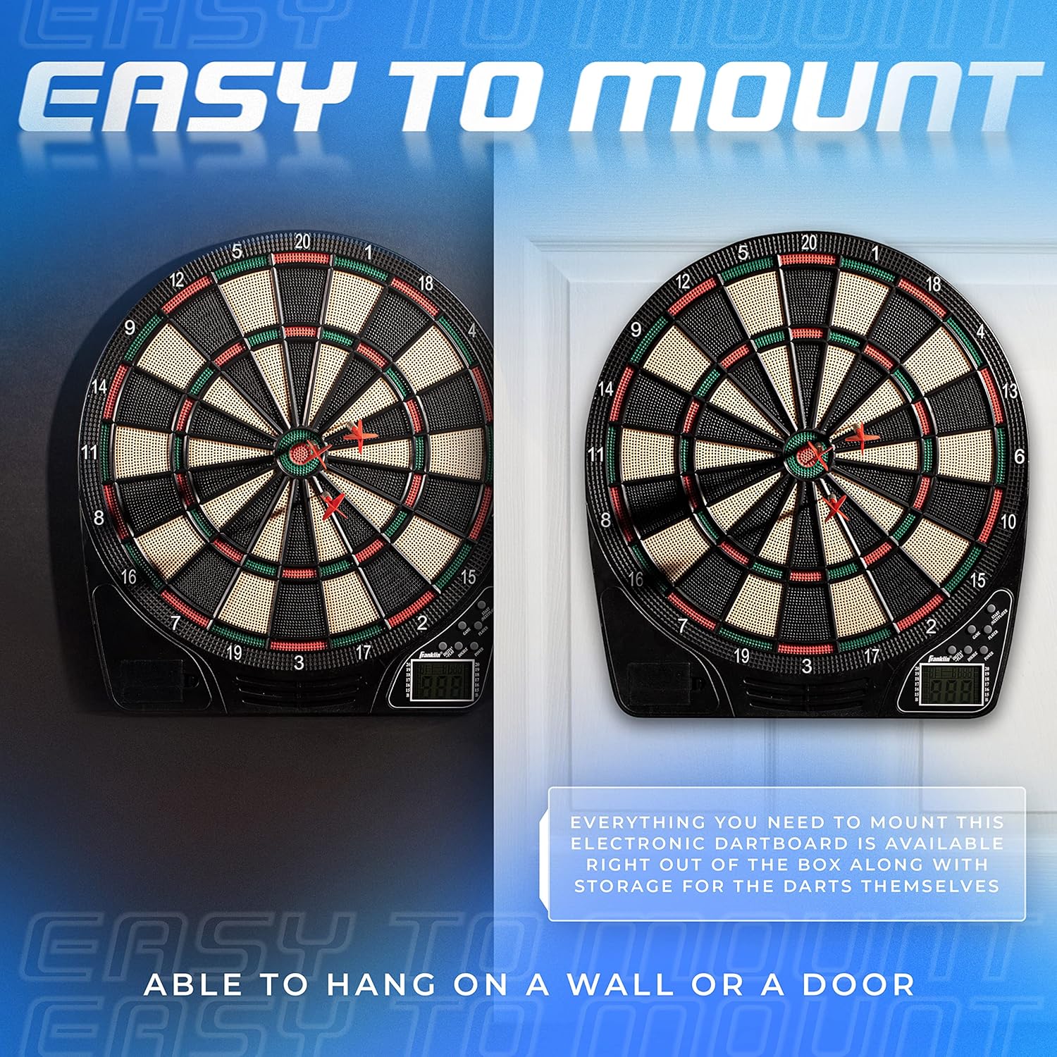 - Easy to mount: Everything you need to mount this electronic dartboard is available right out of the box along with storage for the darts themselves