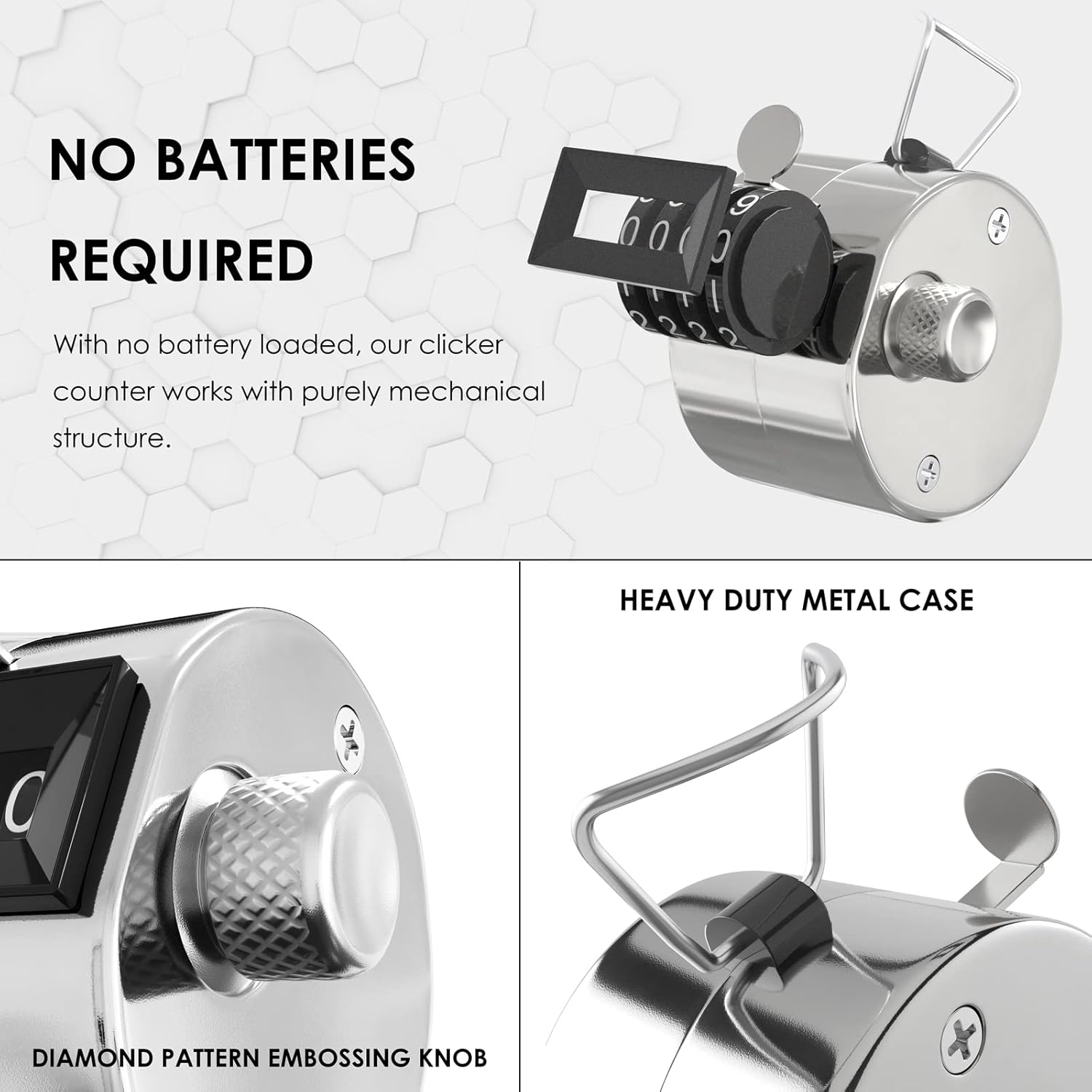- No Batteries Required: With no battery loaded, our clicker counter works with purely mechanical structure, displaying 4 digits accurately. No need to worry about the power source anymore. Time to choose the counter which is eco-friendlier and more durable!
