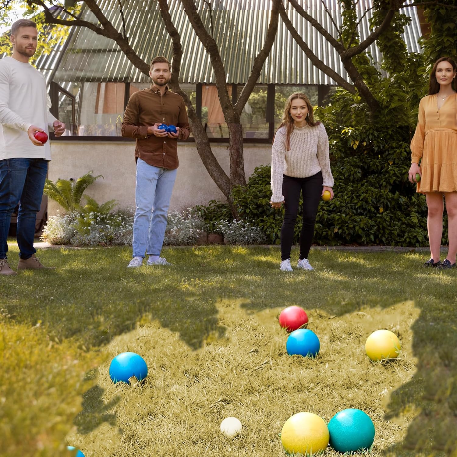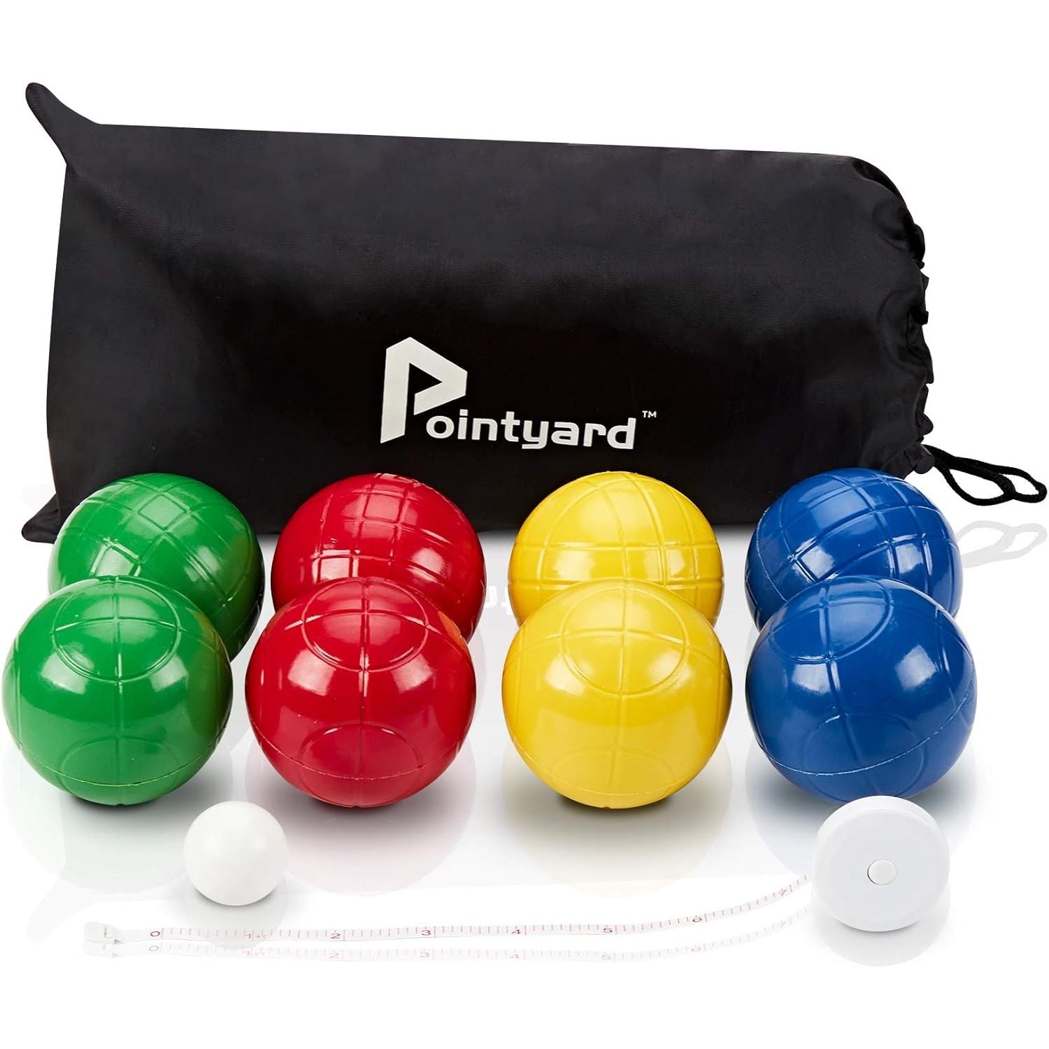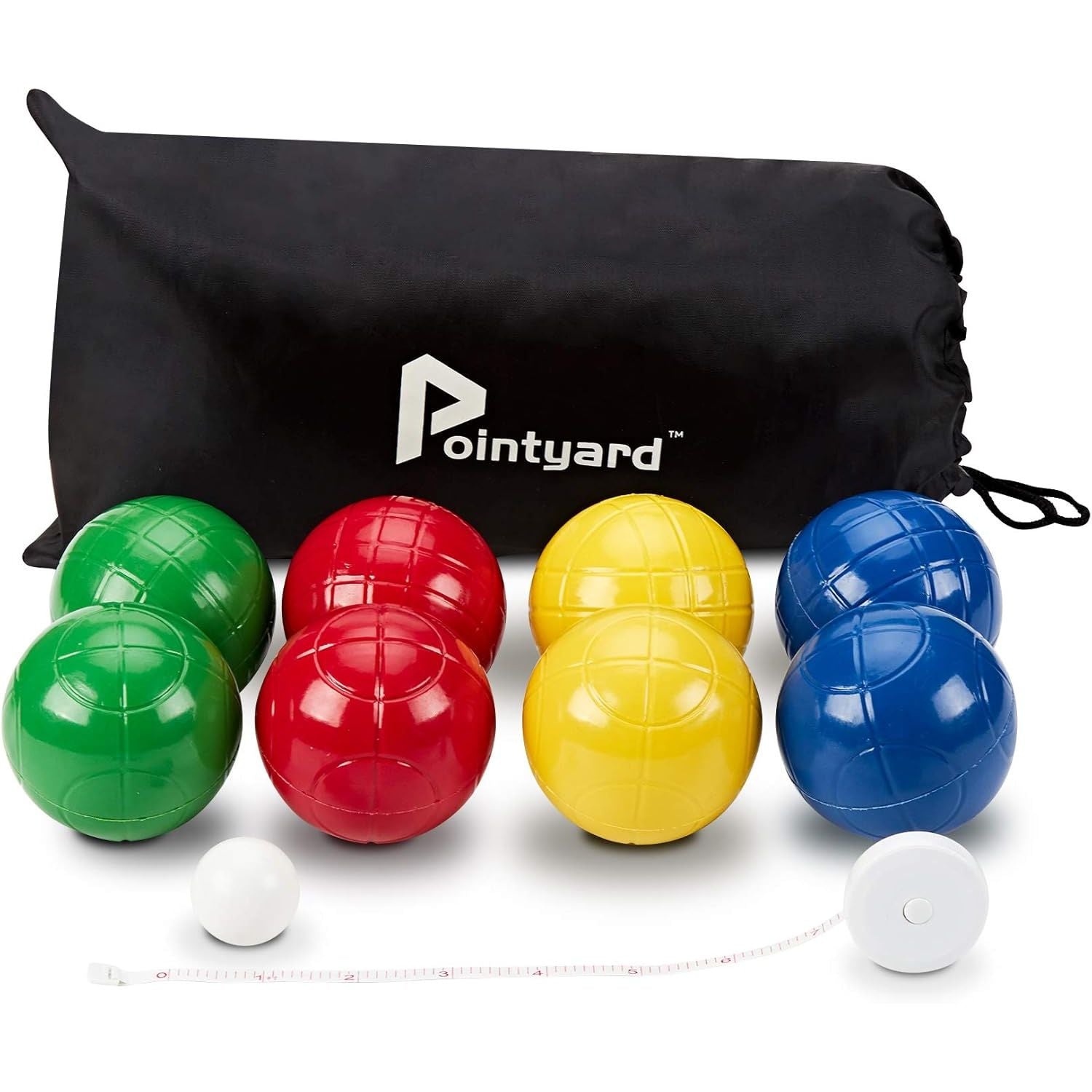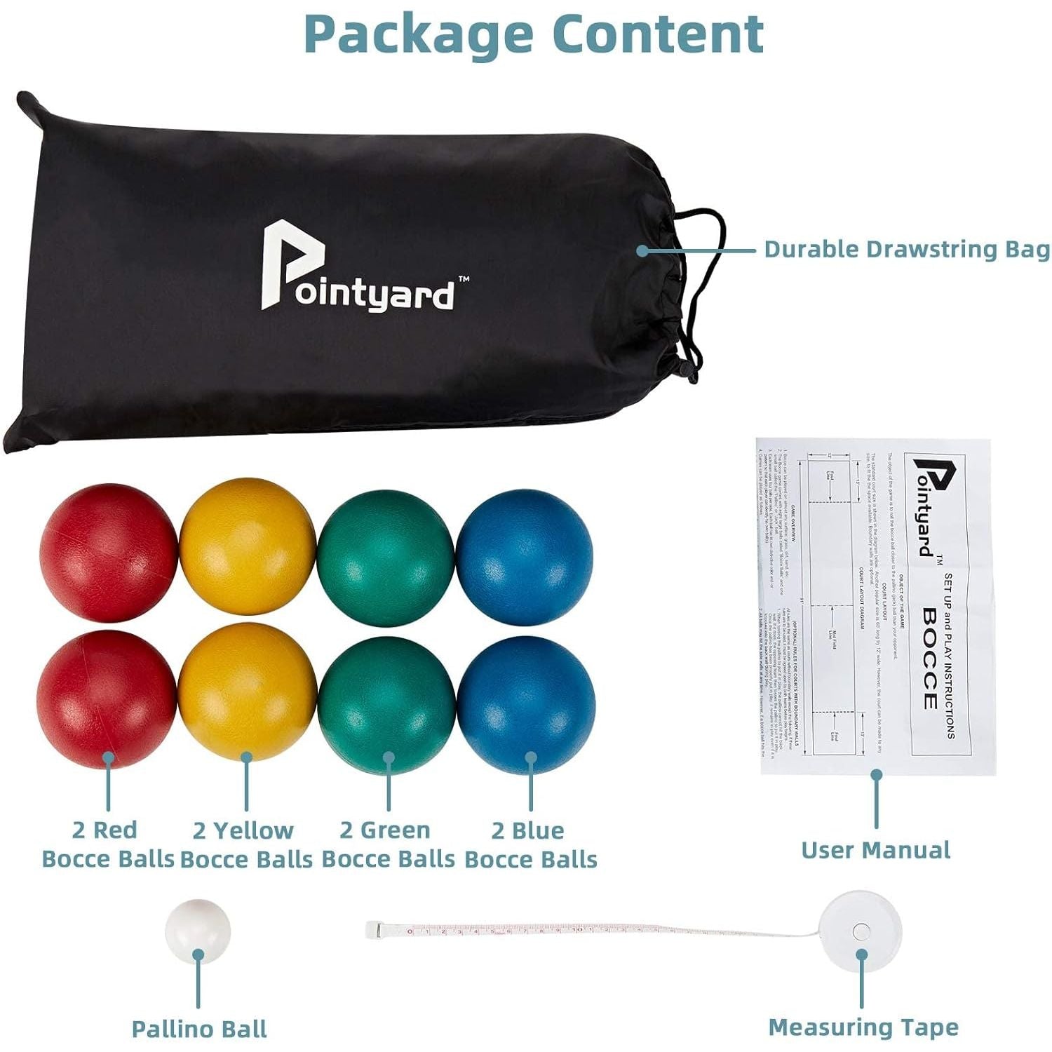 - Economic 4 Colors Bocce Balls For Beginners: Pointyard Bocce Set includes 8 pcs 84mm colorful PE bocce balls (2 Red, 2 Green, 2 Blue, 2 Yellow), 1 x 40 mm White Pallino, 1 x Carrying Zipper Bag, 1 x Measuring Rope, which includes everything you need to start a fascinating Bocce Balls Games, allowing 2-8 players to join the entertainment