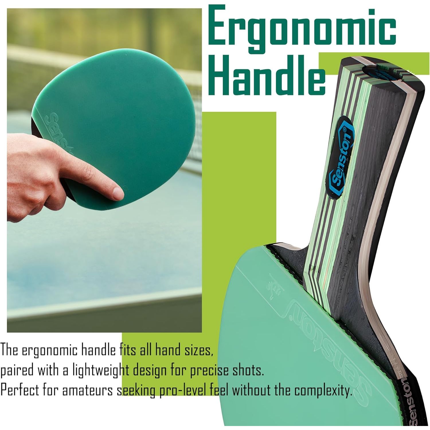 - ★ Excellent Grip ★ Senston ping pong racket with ergonomic flared handle (holder) for comfortable grip of long session. The wood handle is flared for comfort with good sweat absorption performance and offers incredible command of the ball.