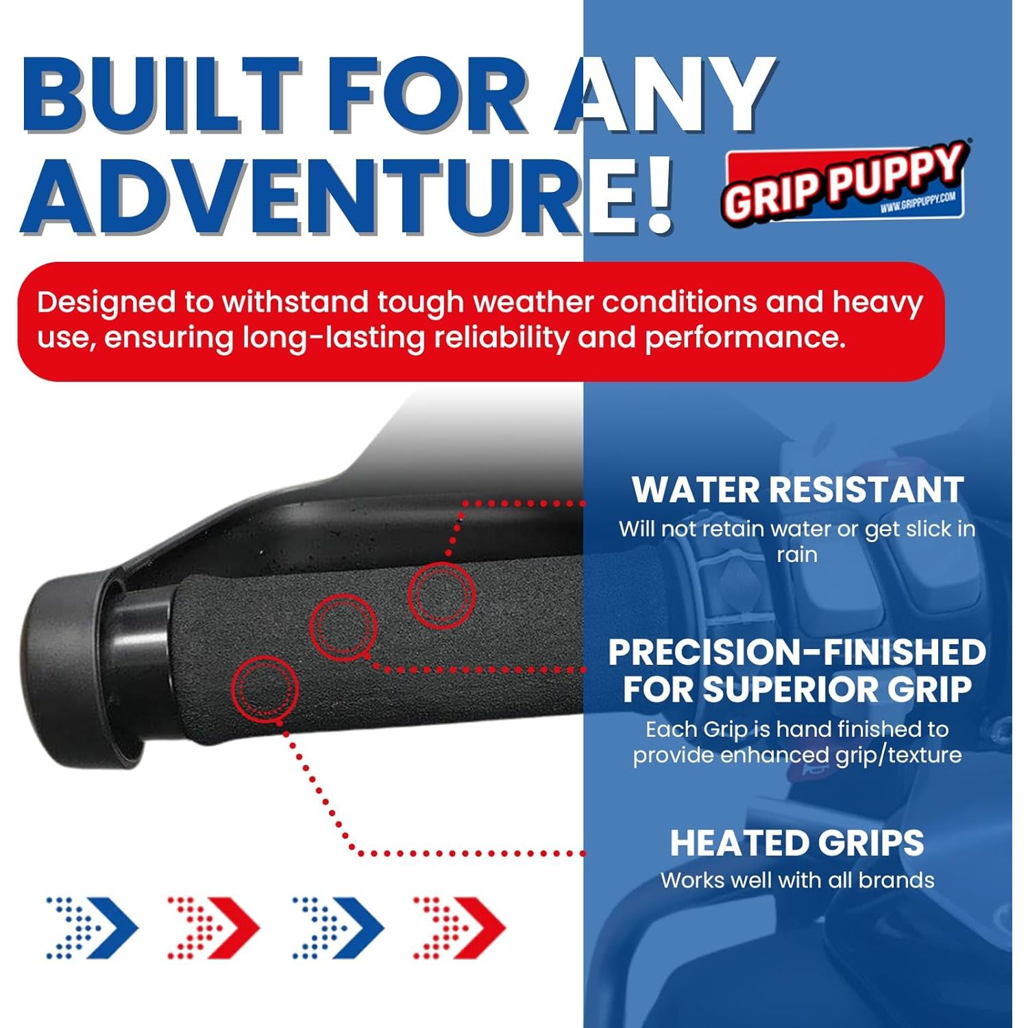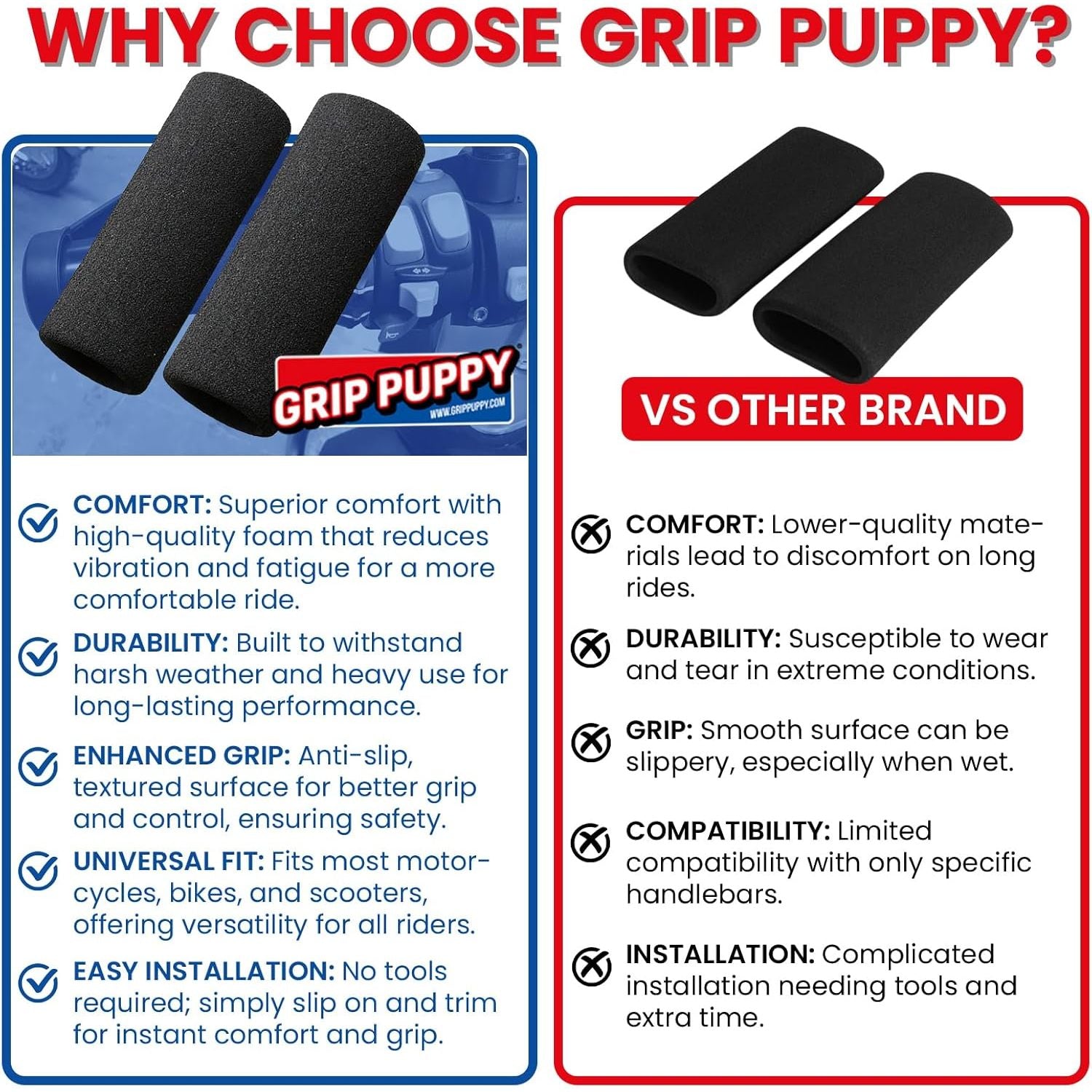 THE ORIGINAL AND THE BEST - TRUST IN GENUINE GRIP PUPPY. Designed for motorcycle, scooter and ATV use, Grip Puppy are taking the Cycle World by storm. These over grips fit OVER standard round type cycle grips. Simply lubricate inside of Grip Puppy with dilute soapy water and wrestle them on over the top of your standard grips. They can be simply trimmed to length if needed. Let them dry out and enjoy the ride! You won't believe the difference they make. These are great for adding a little extra thickness and comfort to your grips. Will also work with heated grips. Reduce vibration. Thousands sold!