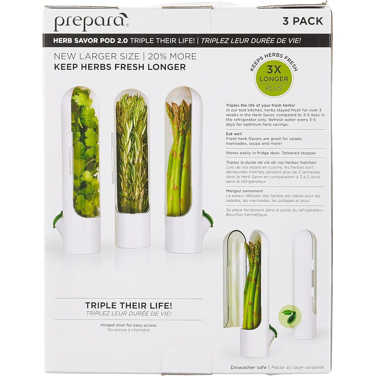 Prepare herb savor pod 2. 0 is the new and improved smaller version of Prepare beloved herb savor. These pods are designed to neatly store fresh herbs and prolong the life of fresh cut herbs for up to three weeks. The new 2. 0 version is 20% Larger and features a hinged door for easy access. To use, Open the hinged, clear door and place your clean, fresh herbs in the Pod with stems pointing down. Pull out the Green stopper at the base of the pod, fill the pod with fresh water through the stopper opening and replace the stopper. You can store your Prepare herb savor pod 2. 0 neatly inside a refrigerator door. The herbs will draw the water up through their stems and stay fresh thanks to the water at the base of the pod. For best results, change and refresh the water on a regular basis. This set includes three herb savor pods, so you can keep flavorful herbs stored separately. Also great for asparagus. Bpa free, top rack dishwasher safe.