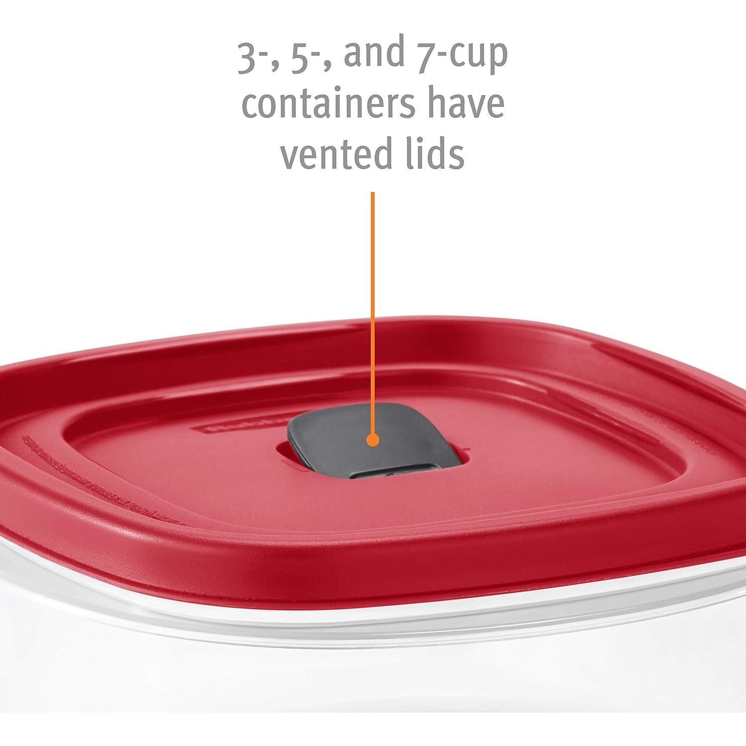 Easily store food while minimizing clutter around your kitchen using Rubbermaid Food Storage Containers with Easy Find Lids. Featuring a new built-in vent for splatter-resistant microwaving, these meal prep containers are easy to organize and help conserve space in your cabinets. The lids snap to each other and to the bottom of the containers and have a bright red color, helping ensure that they are always easy to find. Constructed from durable, BPA-free plastic, these food containers are built to withstand a wide range of temperatures and are dishwasher, microwave, and freezer safe. Thanks to their clear bases, it's easy to see the contents of any container.