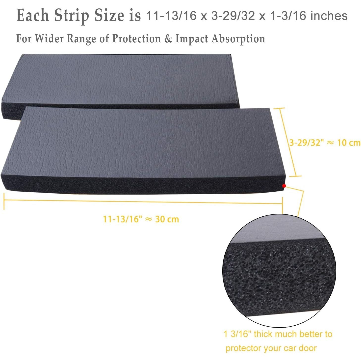 - 1-3/16 Inches Double Thickness: High-density self-adhesive 3cm thick foam for effective protection against scratches, dents, and bumps, simply attach to any wall to prevent damage to vehicle door edges & bumpers. 6 sheets 11-13/16 x 3-29/32 x 1-3/16 inches for FULL protection.
