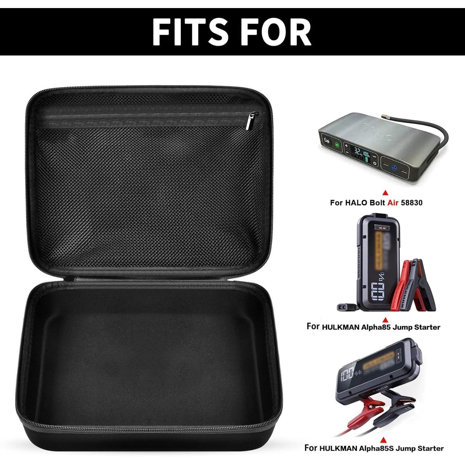 - Portable Wireless Charger Organizer Holder Fits for: Portable charger case designed for car starter jumper power bank, compatible with HALO Bolt Air 58830 Mwh/ 57720/ Air+ Emergency Power Kit with Tire Pump and for ACDC Max/ for HULKMAN Alpha85/ for Alpha85S Jump Starter 2000 Amp 20000mAh Car Starter. Portable phone charger case make your life become more simple and convenient.(Case Only)