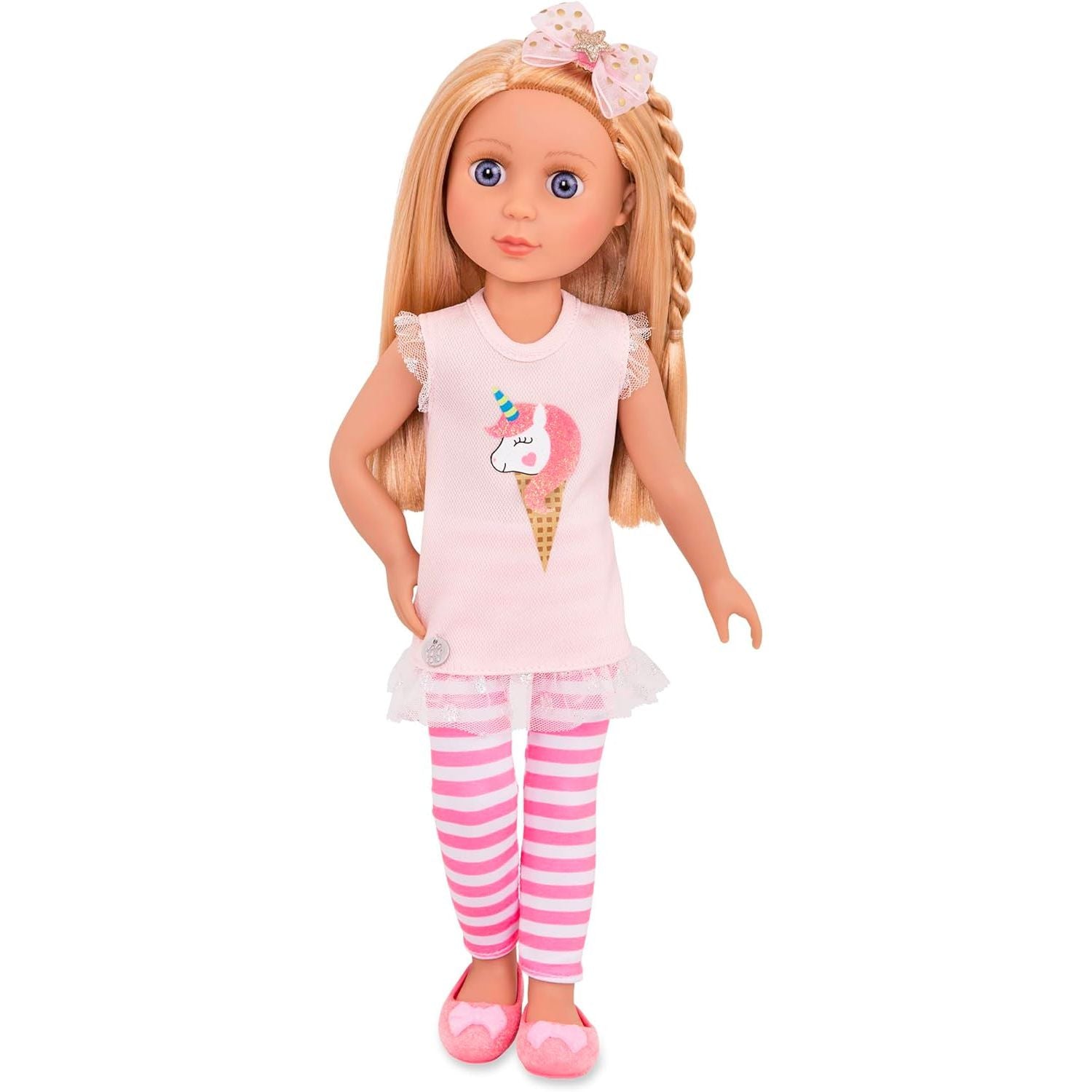 - Silky and long golden-blonde nylon hair that is fun to brush and style.
