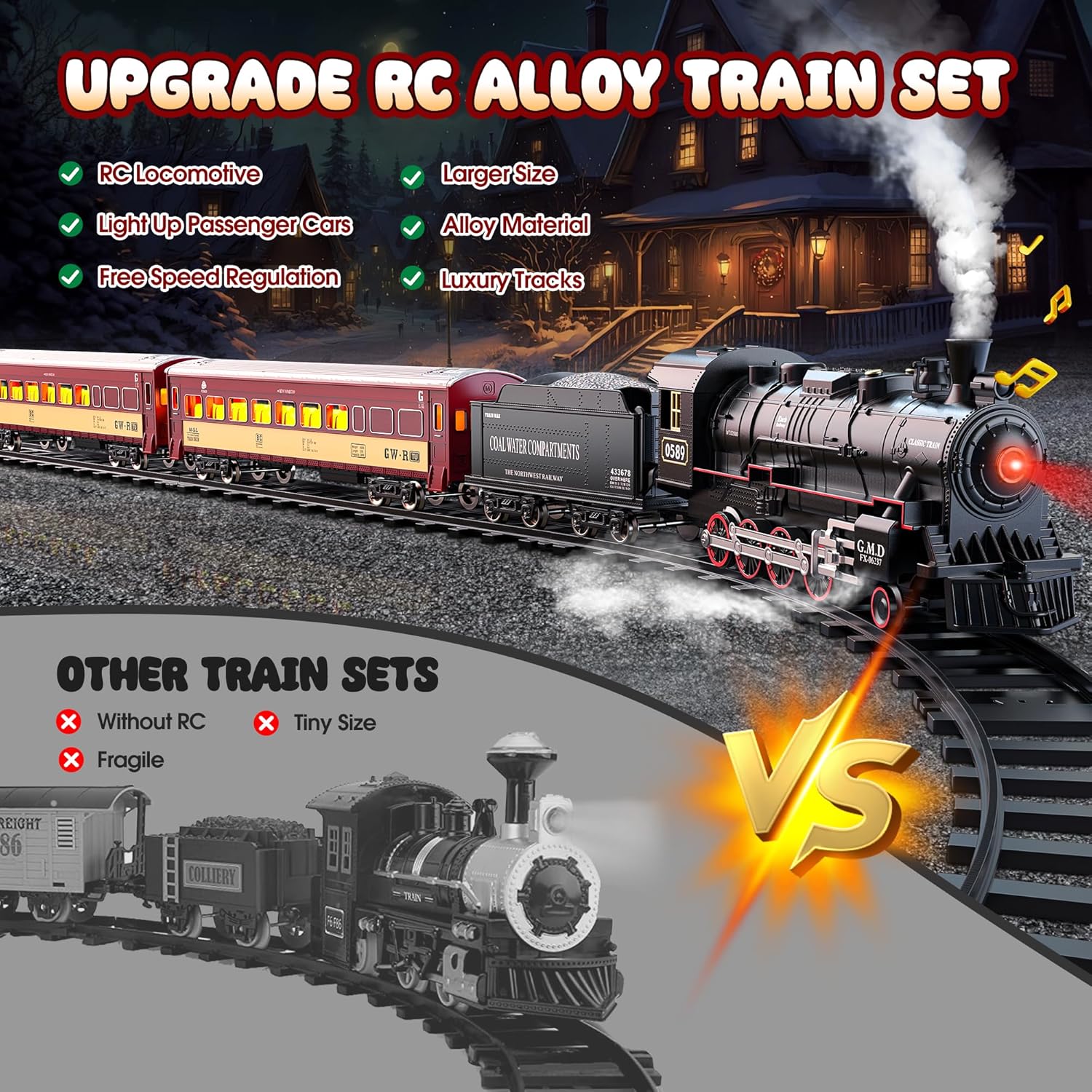 - ALLOY RC TRAIN SET: This train set includes 1 steam locomotive, 1 coal carriage and 2 glowing passenger carriage, 1 remote control, 8pcs straight tracks, 8pcs curved tracks, 4 Y-shaped tracks and 1 cross track to start the fun train games. For this electric train set, we increased the number of locomotive wheels to 4 pairs, and added more smoke outlets to realistically simulate the appearance of steam train. Total track width: 6cm/2.36in