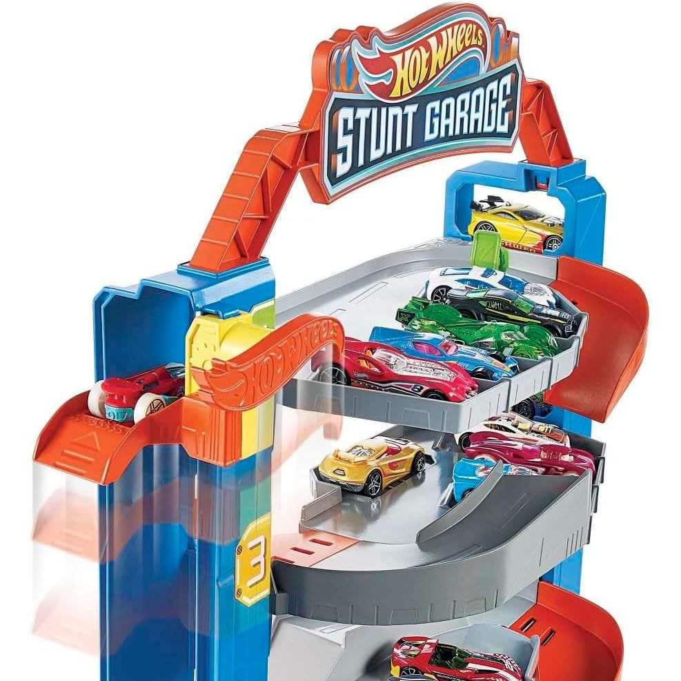The Hot Wheels City Stunt Garage is the only garage that let's kids cars jump from one floor to the other! Use the elevator to bring cars to any level and decide to park the car there or stunt down, jumping to the lower floor. Kids can use the shifters to guide their car to a specific level, or they can go to the main floor for a total car check. Fuel it up and make sure the car is ready for the next adventure! Each set connects directly to other Hot Wheels City sets and grey City track; still compatible with your orange track.