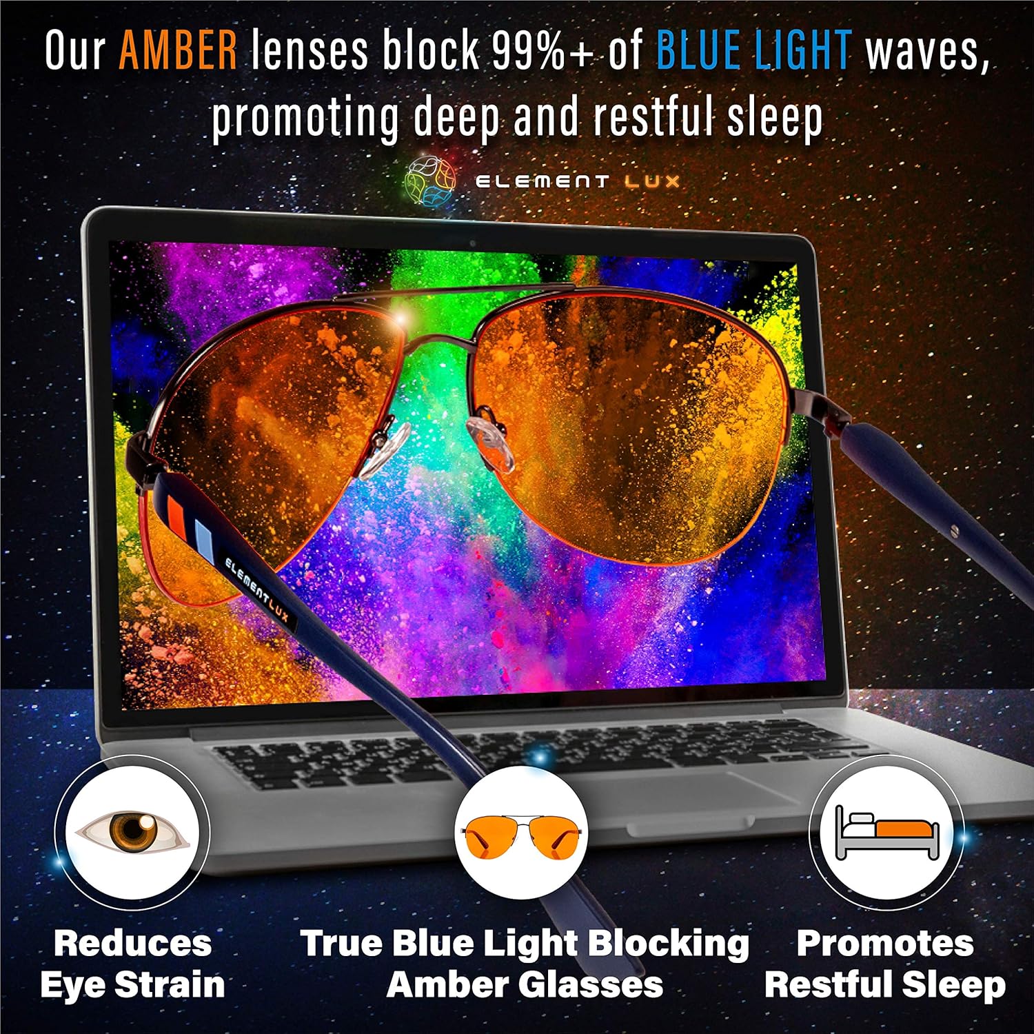 99% Dark Amber Tint: For a Good Night's Sleep. Nighttime entertainment should relax us, but the blue light of laptops, phones, TV’s and lighting around our home inhibits organic melatonin production and elevates cortisol. Now, when you wear our Element LUX blue light glasses at night, you can enjoy entertainment AND a good night's sleep!