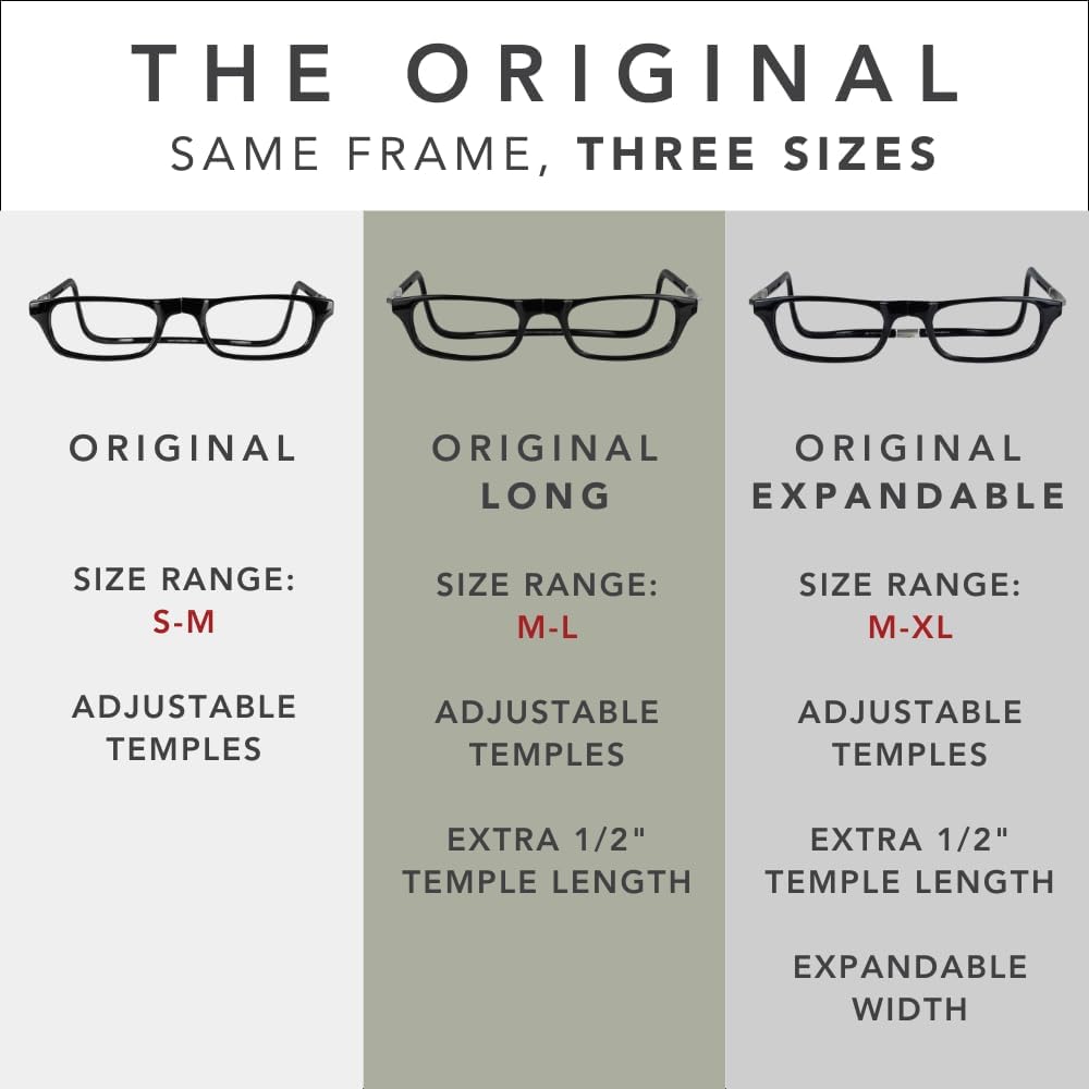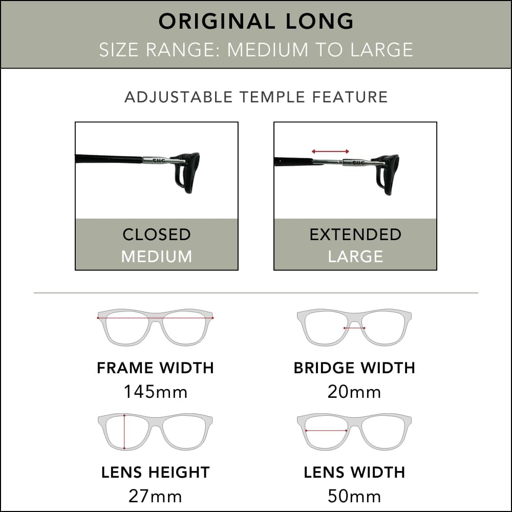 - SIZE RANGE: Medium to Large (M-L). All CliC glasses have adjustable temples that can be fully closed or extended to fit a range of sizes. This style provides an additional ½” in length and 35° stem for a wider feel. See our size chart for specific measurements.