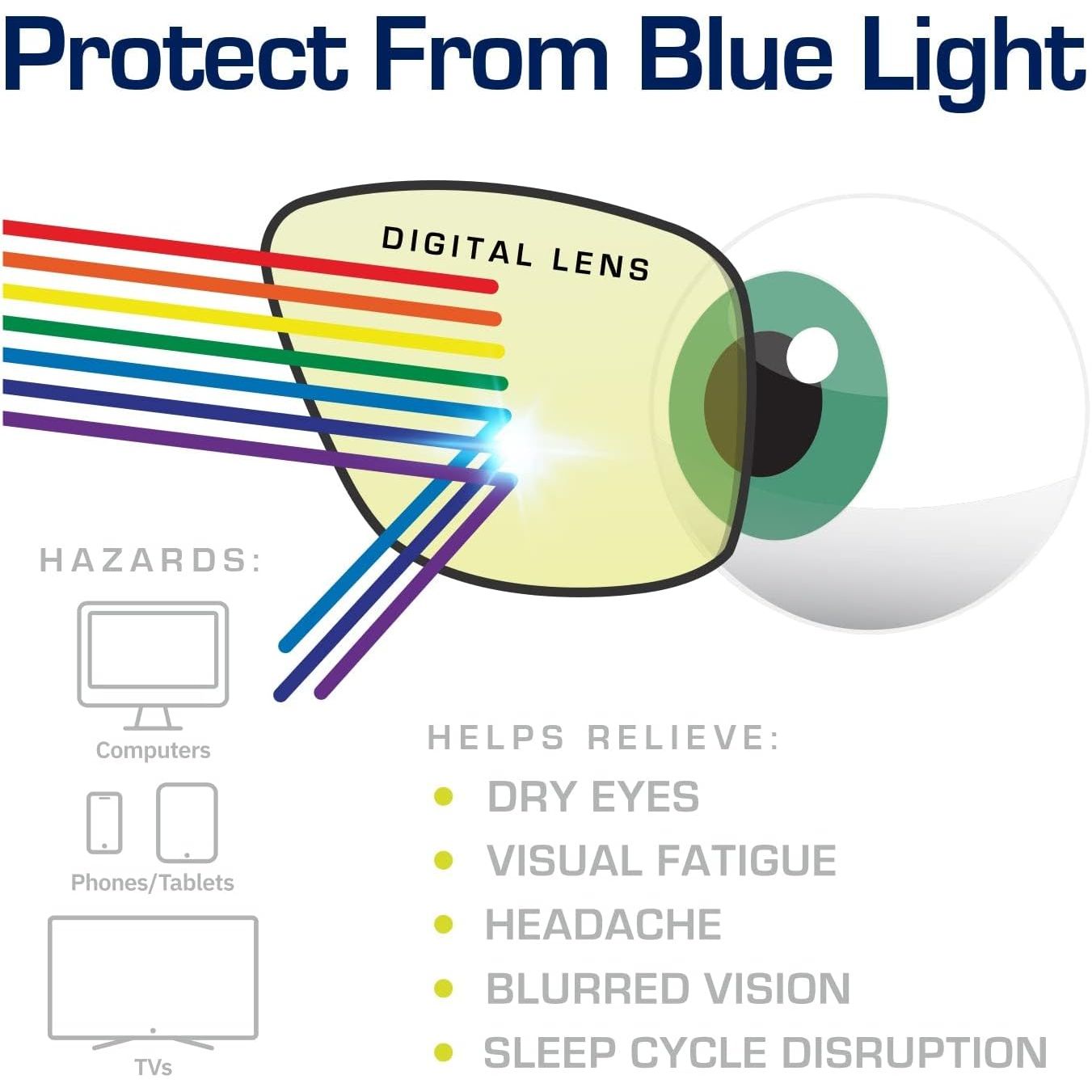 - Package Includes: 1 Pair – Computer Blue Light Blocking Glasses with amber tinted lenses to minimize Digital Eye Strain caused by harmful blue light emitted from digital screens. Complimentary frame carrying case and cleaning cloth.