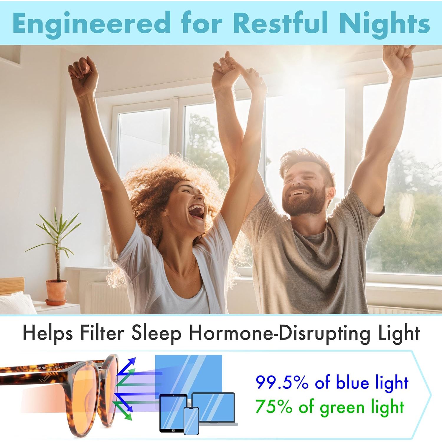 - Orange Blue Light Blocking Glasses for Women & Men - Fight the flood of hormone-disrupting light wrecking your rest; Your blue light glasses filter 99.5% of all blue light for naturally better sleep