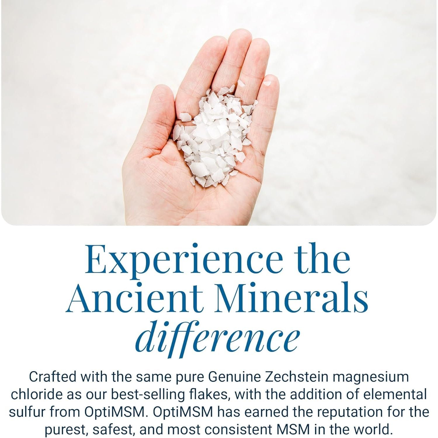- Elevated Mineral Soak with OptiMSM - Ancient Minerals Magnesium Flakes Ultra combines pure Zechstein magnesium chloride with OptiMSM—an organic sulfur compound—designed to support whole-body renewal through mineral-rich bathing.