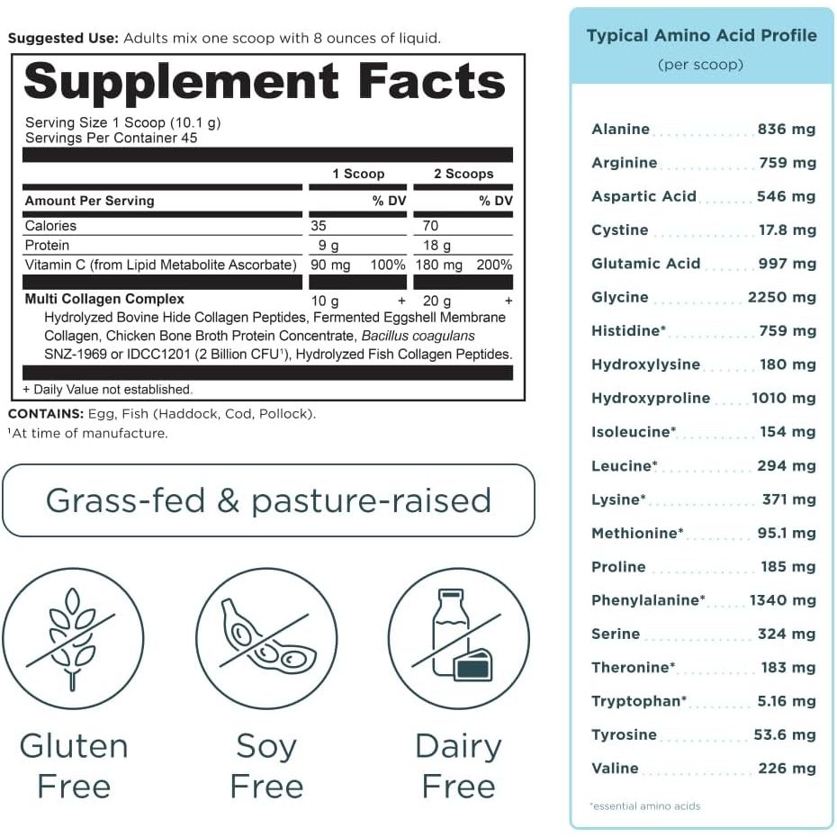 - Contains 10 types of collagen from 4 real food sources - beef, chicken, fish and fermented eggshell membrane; Delivers full-body benefits for healthy hair, skin, nails, joints and gut.