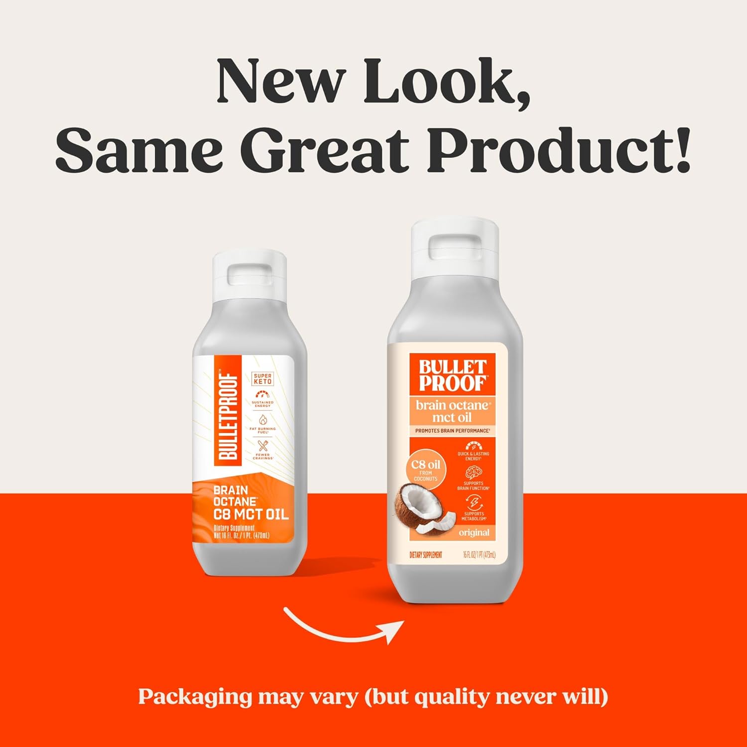 - Bulletproof Coconut Brain Octane C8 MCT Oil, 16 Ounces, Premium Keto Supplement for Sustained Energy, Brain and Body Fuel, Unflavored, Add to Coffee and Smoothies, Packaging May Vary