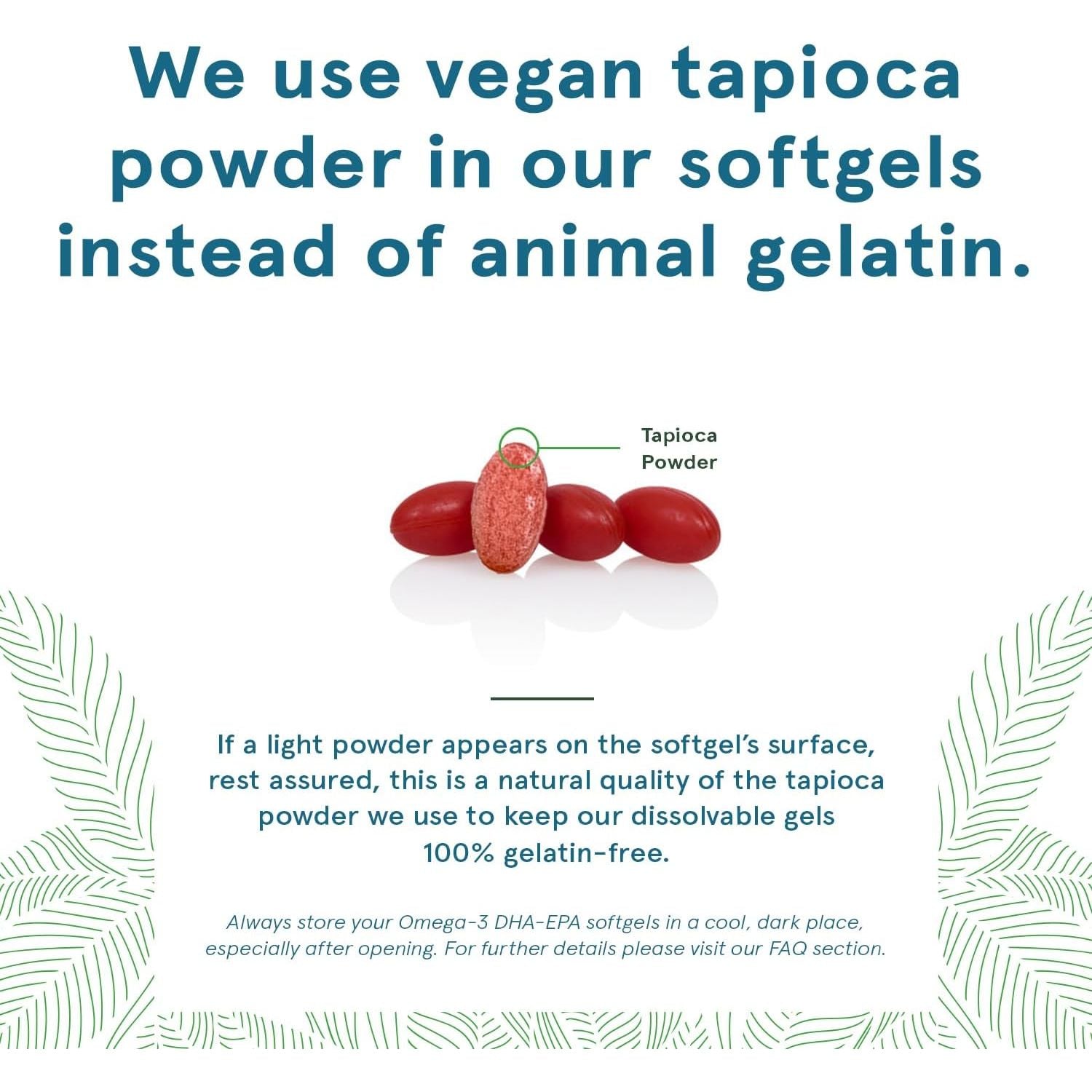 - TAILORED FOR VEGANS & VEGETARIANS - This EPA DHA supplement is suitable for vegans and vegetarians. It is Free of yeast, wheat, gluten, salt, hexane, dairy, egg, fish, animal products, byproducts or derivatives.