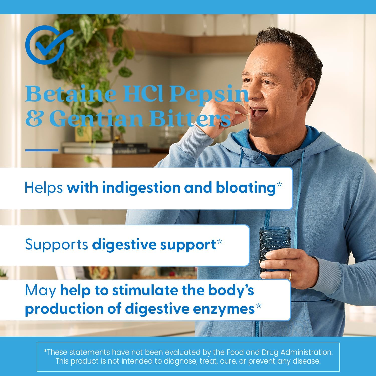 Betaine hci/pepsin/gentian bitters contains three nutritional factors that perform complementary functions designed to support the efficiency of the digestive process. supplementing with betaine hci may support the stomach's digestive capacity.* pepsin is an enzyme produced by the body to digest protein-containing foods in the stomach. pepsin works in conjunction with stomach acid to support protein digestion.* gentian is an herb used to optimize the digestive capacity and tonify the digestive tract. its bitter nature may help to stimulate the body's production of digestive enzymes.*for optimal digestive support, use this supplement in conjunction with best digestive enzymes - all vegetarian, a uniquely formulated, full-spectrum high potency digestive enzyme blend.