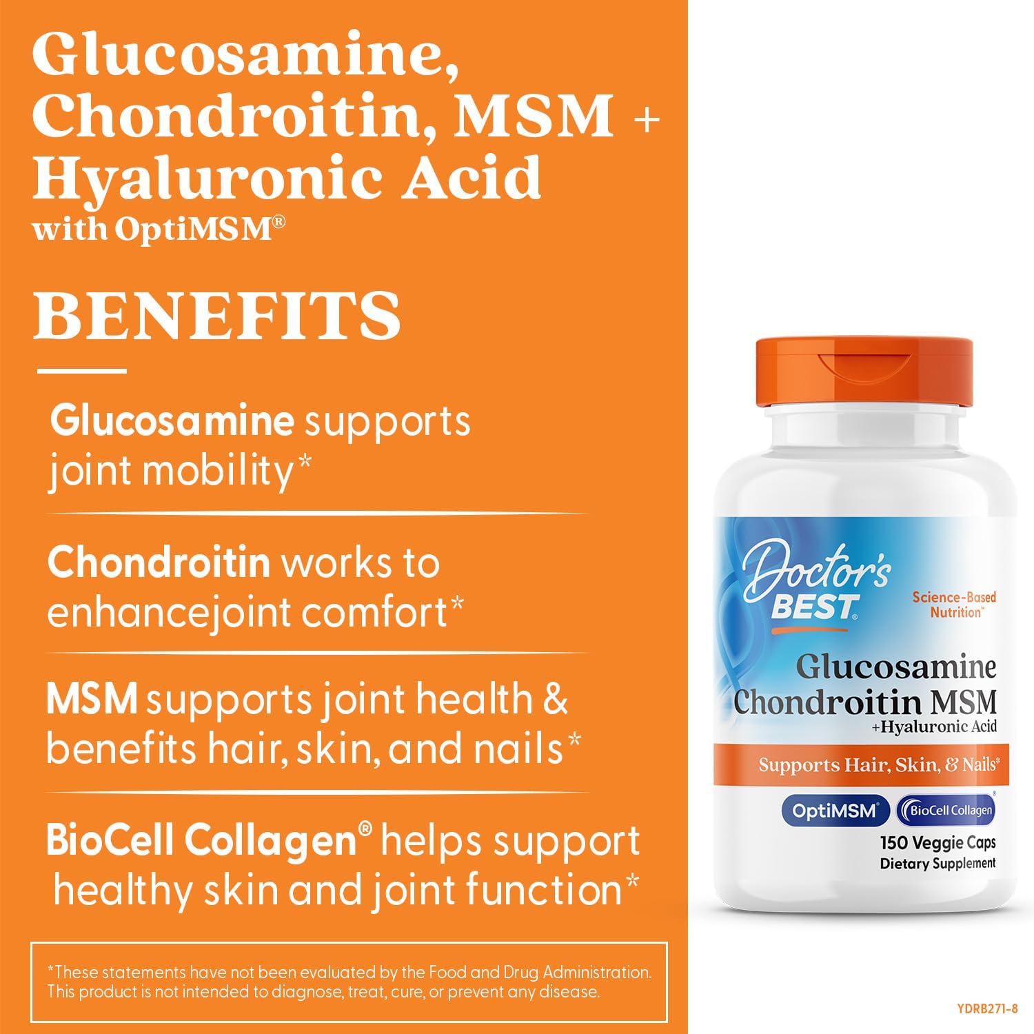 - Doctor’s Best Glucosamine Chondroitin MSM + Hyaluronic Acid provides you with the perfect combination of potent dietary supplements that will help you maintain and support your healthy joints throughout your active lifetime.
