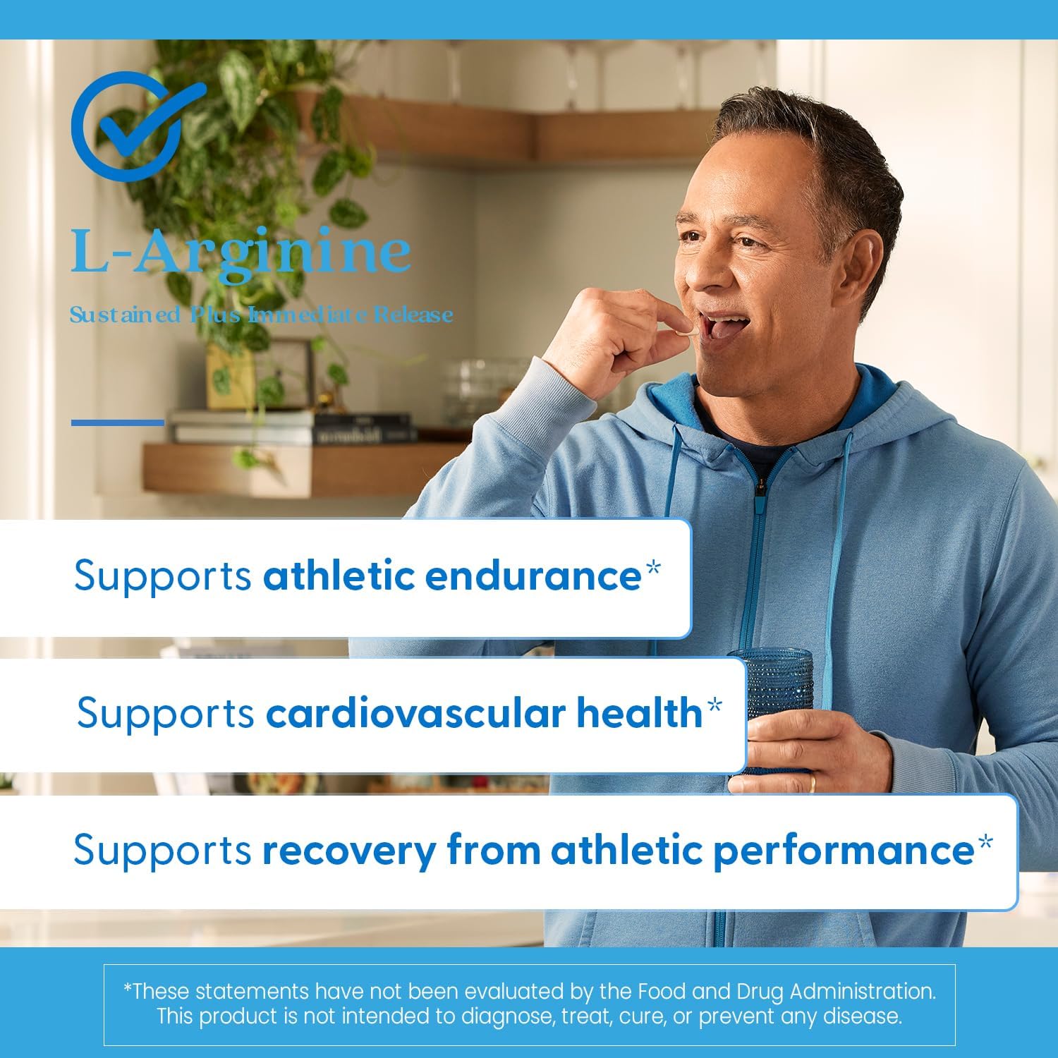 Sustained plus immediate release l-arginine contains this conditionally essential amino acid in a bilayer tablet, with two tablets providing 500 mg of sustained release and 500 mg of immediate release l-arginine in a formula that allows for enhanced blood levels of this nutrient. most supplemental l-arginine is quickly absorbed into circulation and is extremely efficiently metabolized, yielding only a short-lived boost to l-arginine levels. sustained plus immediate release l-arginine tablets are specifically manufactured to immediately increase blood levels of l-arginine and then to sustain this beneficial increase continuously over an 8-hour period.*l-arginine has been shown to support the cardio- vascular system, promote vigorous heart function and enhance healthy circulation throughout the body through its conversion to nitric oxide.* research suggests l-arginine supplementation may also have positive benefits on athletic performance.*