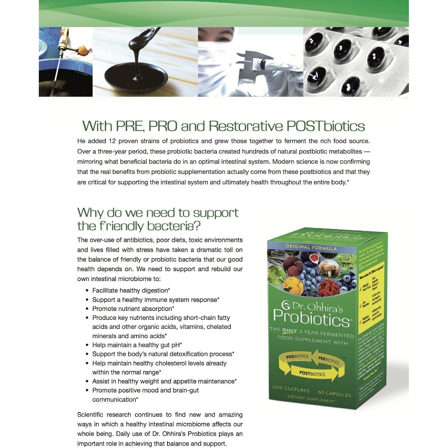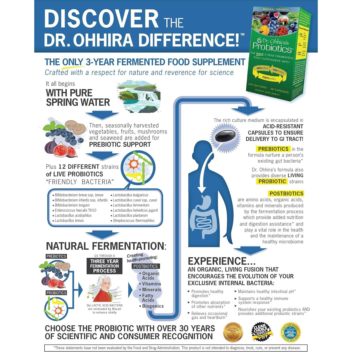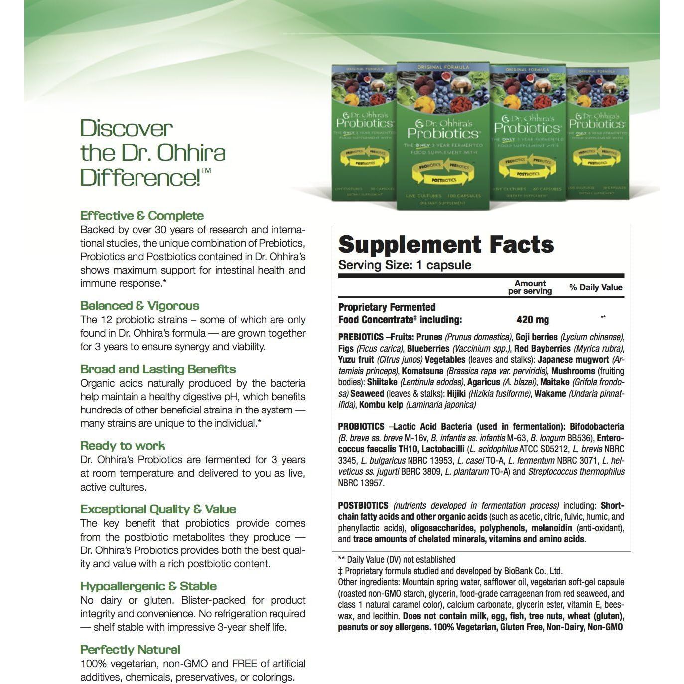 - THE DR. OHHIRA'S ORIGINAL PROBIOTIC capsule contains prebiotics (the fruits and vegetables) with strong and effective probiotic bacteria (12 strains) and postbiotic metabolites that the probiotic bacteria have been producing during three years of fermentation, including vitamins, amino acids, short-chain fatty acids (SCFAs), immune system-enhancing compounds, detoxifying agents and many other beneficial substances which support digestive function, whole health and improve the pH of your colon.