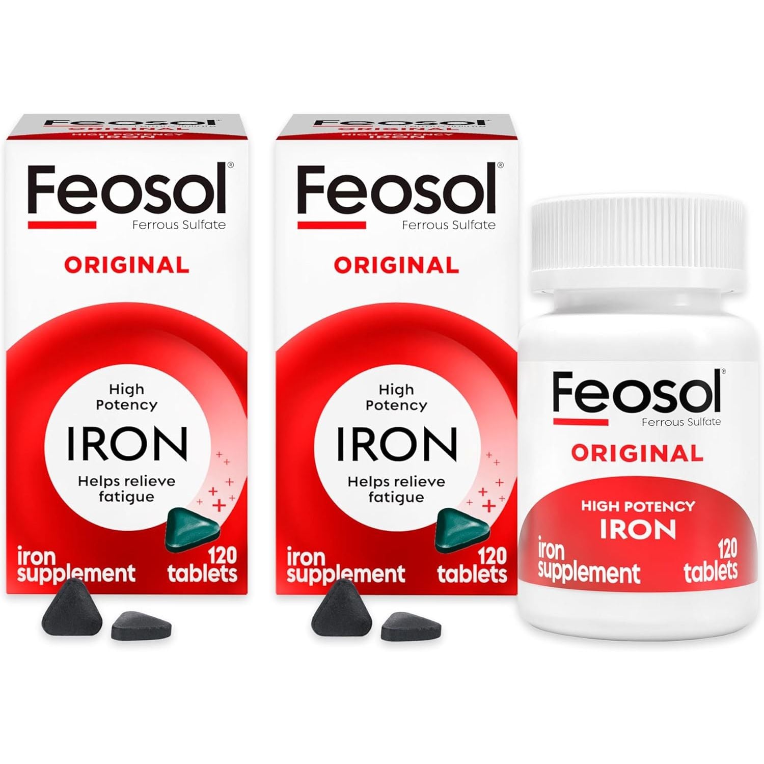 Feosol Original Iron Supplement - The Feosol brand is recommended iron supplement by pharmacists and a trusted leader and innovator of iron supplements for over 70 years. High potency Feosol Original uses ferrous sulphate, a time tested form of iron. Each Feosol Original small, coated iron tablet contains 65 mg (325 mg Ferrous Sulfate) which provides 361% of Daily Value. Our tablets are for those with an iron deficiency and are vital for red blood cell formation. Sourced from high-quality ingredients, this gluten free 65 mg iron supplement has no artificial flavors. Adults and children over 12 years of age can take one 65 mg iron tablet daily. Our Feosol Original formula is available in a 120 tablet bottle which is a 4 month supply. Made in the USA.