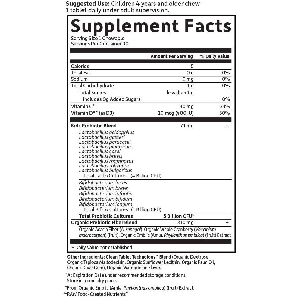 - WHOLE FOOD VITAMINS FOR KIDS: One-a-day Tasty Organic Watermelon flavor chewable probiotics for kids contain 30mg of Whole Food Vitamin C from Organic Amla Berry plus 400 IU of Whole Food Vitamin D, for added immune support—with no added sugar