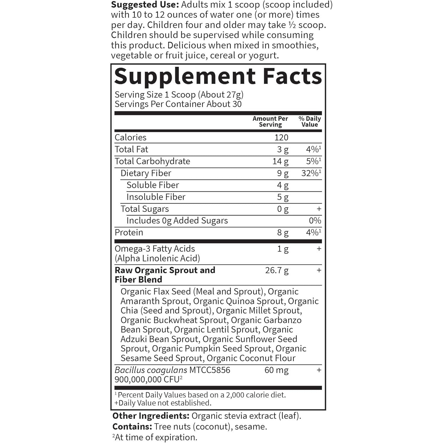 A high-fiber diet provides numerous health benefits, but—let's face it—getting enough dietary fiber through diet alone can be a big challenge. Raw Organic Fiber is an excellent source of fiber, as well as Omega-3 fatty acids from flax and chia seeds. Featuring a soothing and nourishing blend of both soluble and insoluble fiber, Raw Fiber delivers 9 grams of fiber per serving from 100% raw, organic sprouted seeds, grains and legumes—with no harsh fibers such as psyllium, which can be punishing to sensitive colons. The benefits of Raw Organic Fiber powder go beyond typical dietary fiber supplements, supporting digestive and bowel health by helping to maintain a healthy intestinal microbial balance with powerful, Clinically Studied probiotics for additional digestive support.† This unflavored fiber powder for adults and kids 4 and older can be mixed with water or added to your favorite smoothies, vegetable or fruit juice, cereal or yogurt. †These statements have not been evaluated by the Food and Drug Administration. This product is not intended to diagnose, treat, cure or prevent any disease.