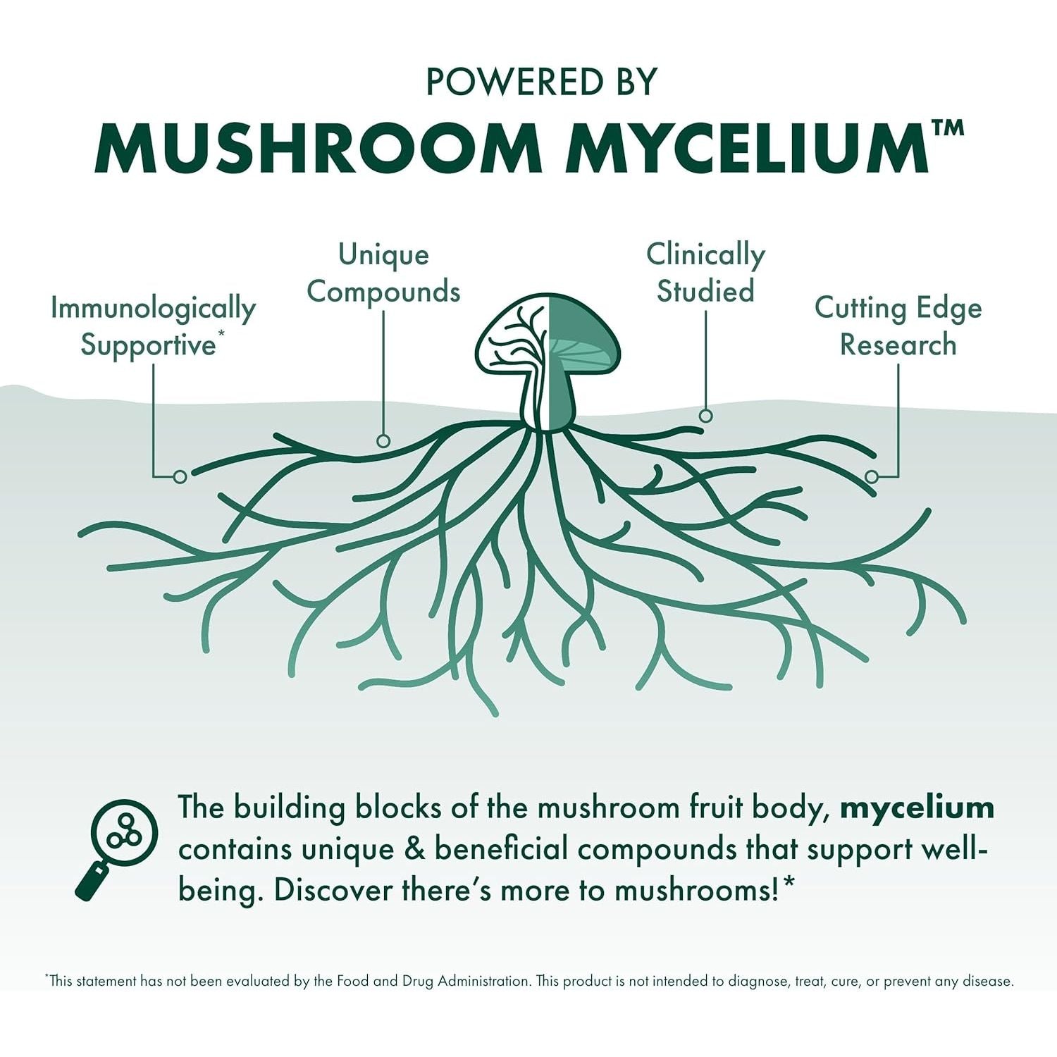 - Powered by Mushroom Mycelium: Our organic mushroom mycelium is grown on organic brown rice substrate; third-party studies show that mushroom mycelium and fermented rice substrate support your health*