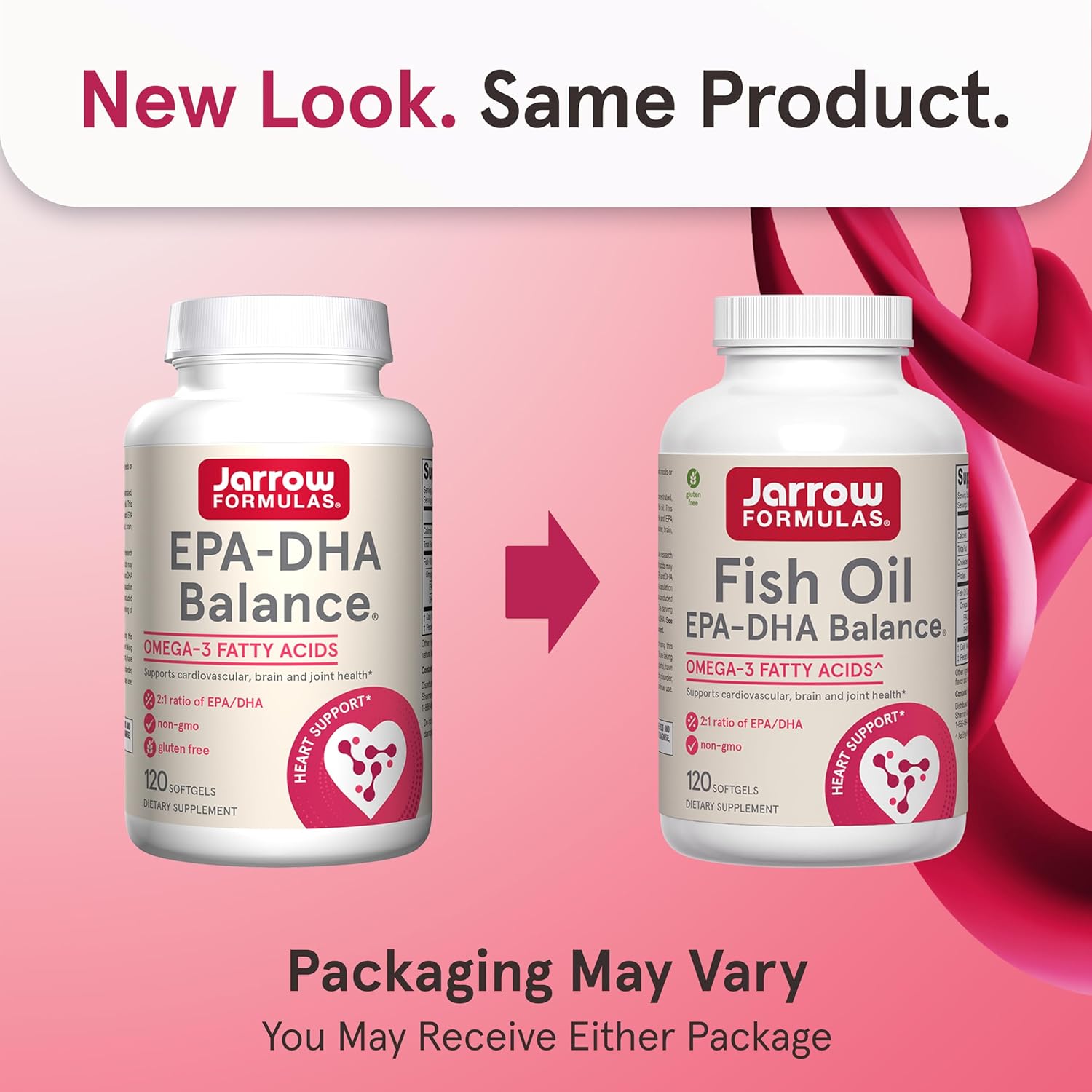 Jarrow Formulas® EPA-DHA Balance® contains ultra-purified, highly concentrated and molecularly distilled omega-3 fatty acids from fish oil. This unique blend provides the synergistic benefits of DHA and EPA omega-3 fatty acids in a 2:1 ratio to support cardiovascular, brain and joint health.(1) This fish oil supplement is non-GMO and gluten free. Adults take two fish oil softgels once a day or as directed by your qualified healthcare professional. Jarrow Formulas® – Superior Science. Smarter Formulas.® Qualified Health Claim: Supportive but not conclusive research shows that consumption of EPA and DHA omega-3 fatty acids may reduce the risk of coronary heart disease. Consuming EPA and DHA combined may help lower blood pressure in the general population and reduce the risk of hypertension. However, FDA has concluded that the evidence is inconsistent and inconclusive. One serving of EPA-DHA Balance® provides 1.2 grams of EPA and DHA.(1)These statements have not been evaluated by the Food and Drug Administration; this product is not intended to diagnose, treat, cure, or prevent any disease.