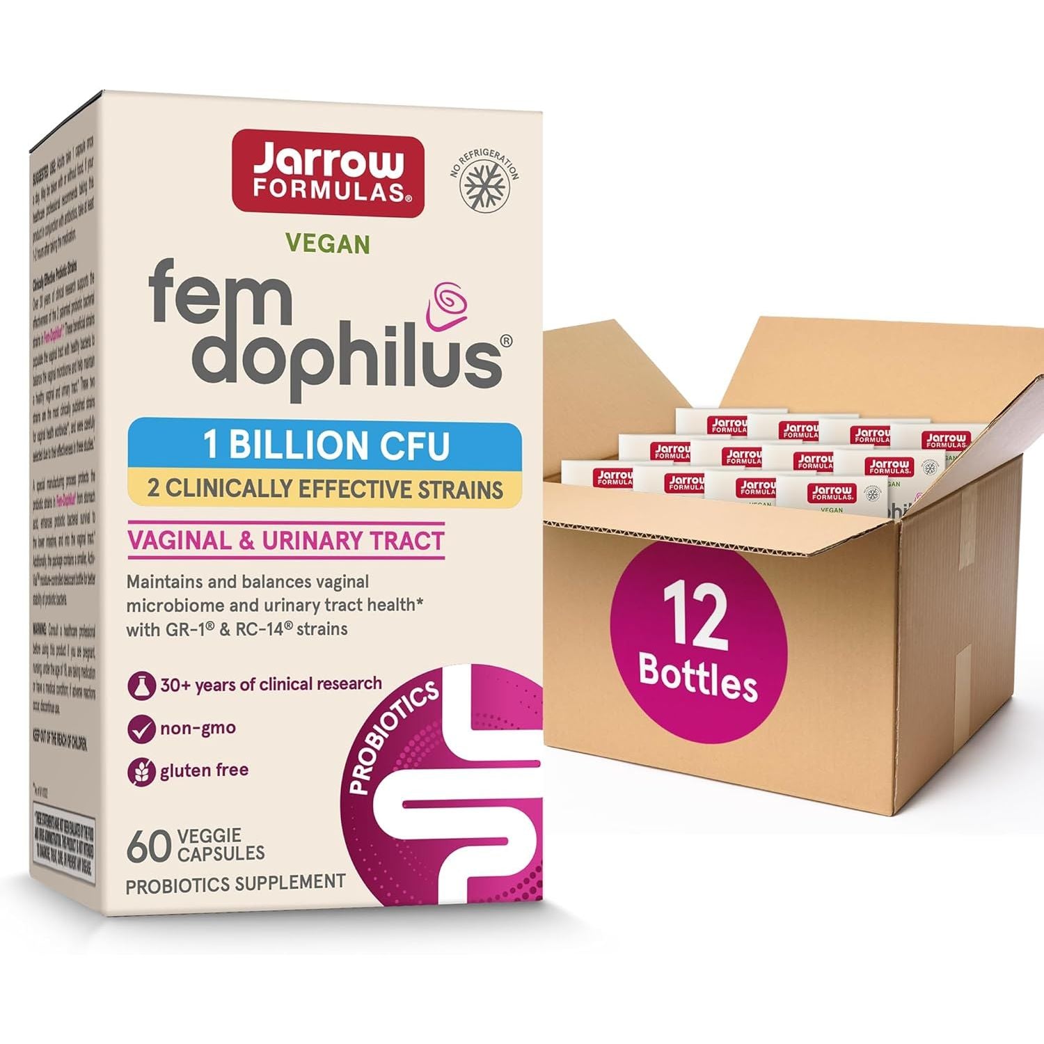 Jarrow Formulas Fem-Dophilus Probiotics promote vaginal and urinary tract health with 1 Billion CFU per serving from two clinically effective strains. Made with high-quality, non-GMO ingredients, this vegan and gluten free dietary supplement contains no wheat, soybeans, dairy, egg, fish, shellfish, peanuts, tree nuts or sesame. This easy-to-take capsules feature two strains that are native to women's bodies and backed by more than 30 years of research demonstrating their safety and efficacy. The patented Lactobacillus rhamnosus GR-1 and Lactobacillus reuteri RC-14 strains in this supplement have been shown to help balance the vaginal microbiome, helping address specific women's health needs. A special manufacturing process helps ensure Fem-Dophilus probiotics survive stomach acid and passage through the lower intestine into the vaginal tract. Suggested Use: Adults, take one capsule once a day with or without food, or as directed by your qualified healthcare professional. If taken in conjunction with antibiotics, take one probiotic capsule at least one to two hours after taking the medication. Informed by strong scientific research, Jarrow Formulas products are carefully crafted to ensure you get the benefit of each and every vitamin, mineral and supplement.