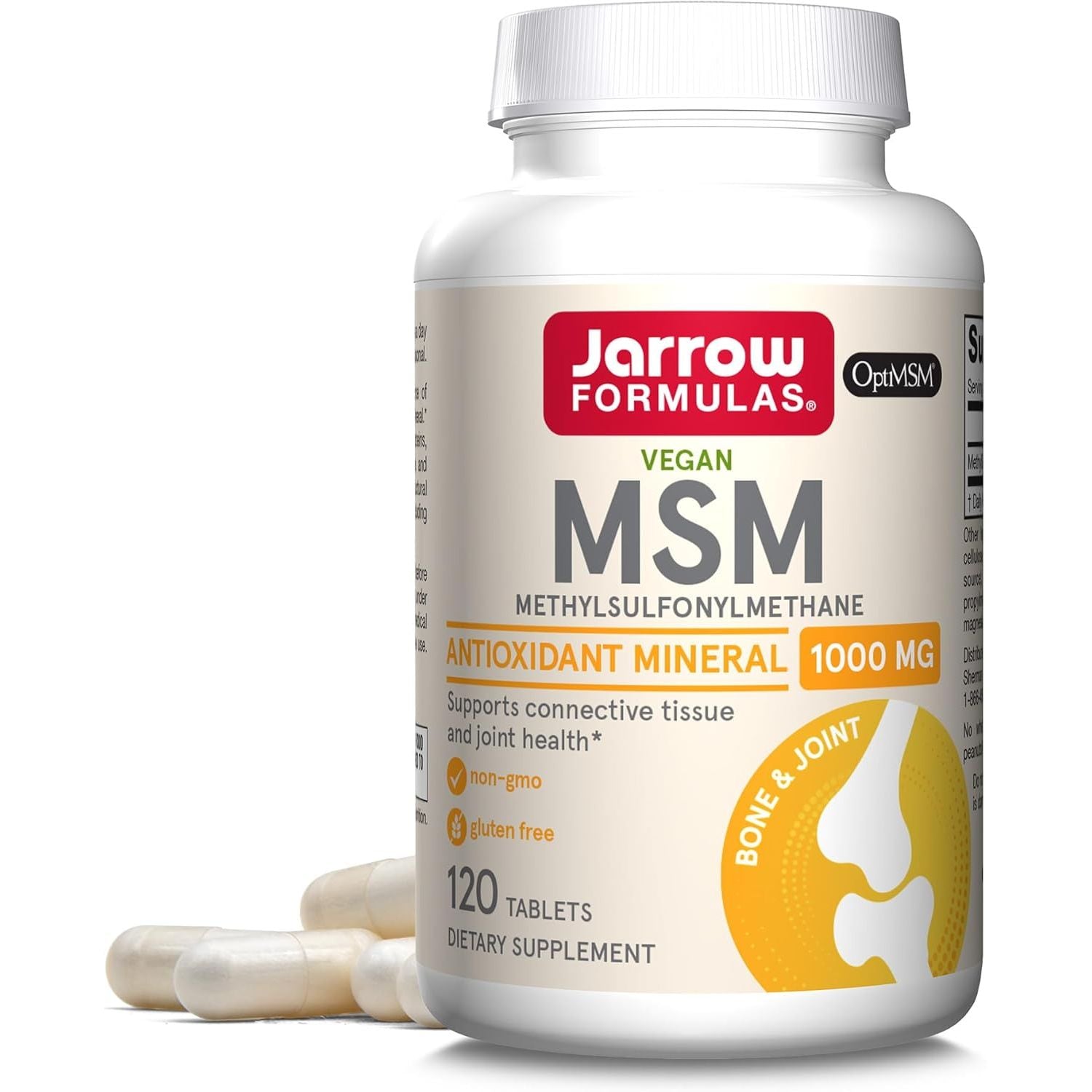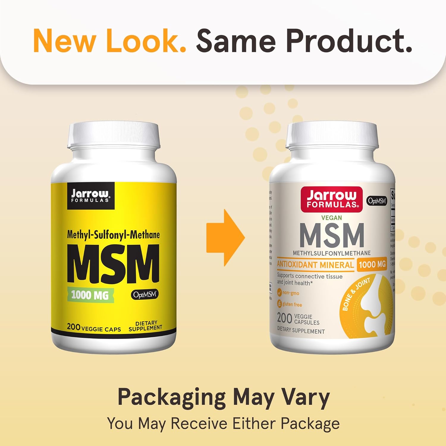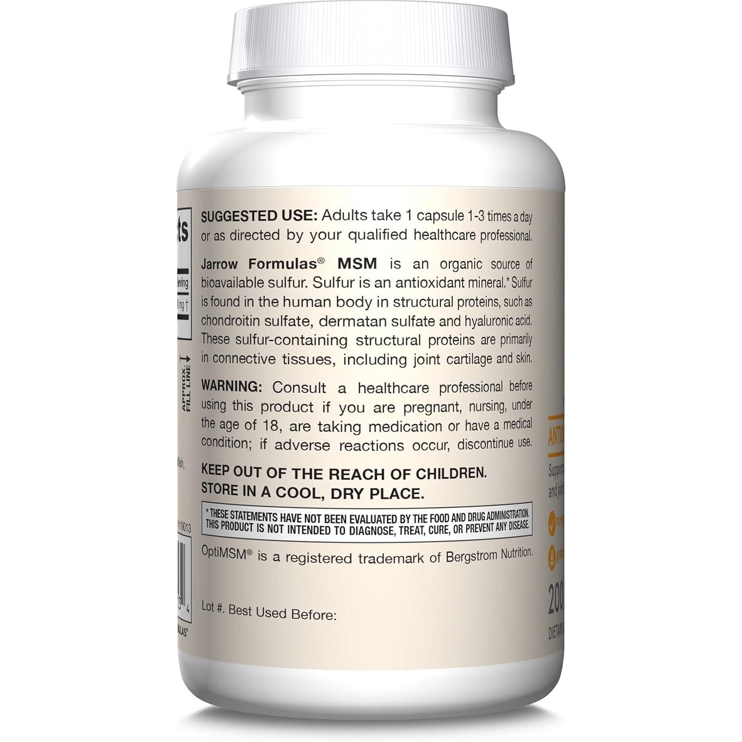 - MSM Sulfur Supplement: One 200 count bottle Jarrow Formulas MSM 1000 mg Capsules for connective tissue and joint health support(1)