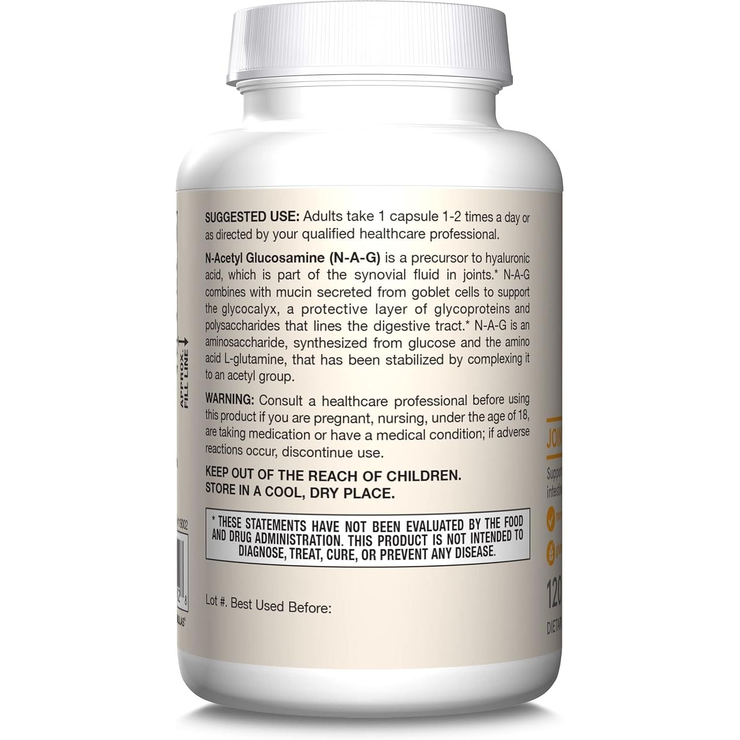 We use superior science to make smarter formulas like Jarrow Formulas NAG is an aminosaccharide, synthesized from glucose and a stabilized form of the amino acid L-glutamine. It's the body's precursor to hyaluronic acid, which is part of the synovial fluid in joints. NAG combines with mucin to support the glycocalyx, a protective layer that lines the digestive tract. NAG supports joint and intestinal health. This formula is gluten free. These statements have not been evaluated by the Food and Drug Administration. This product is not intended to diagnose, treat, cure or prevent any disease.