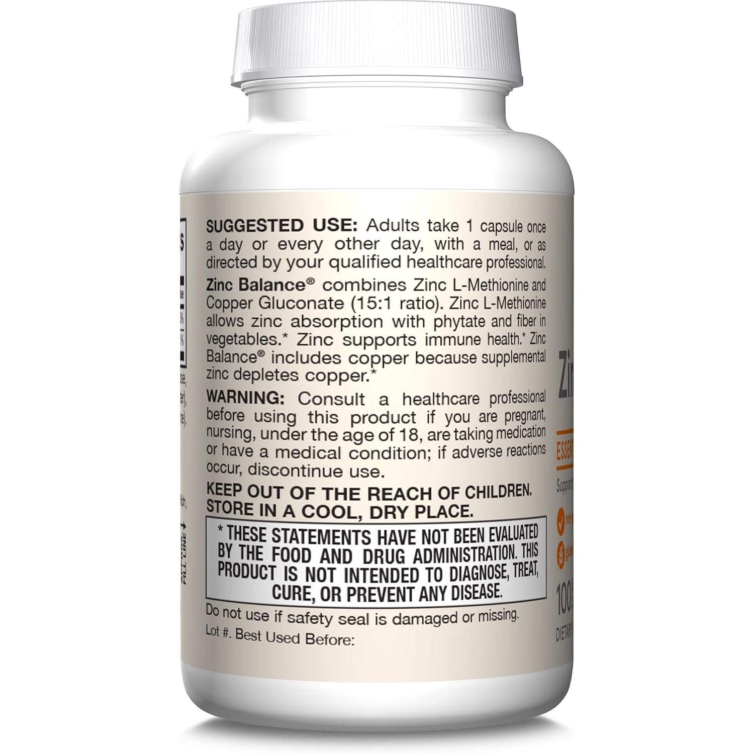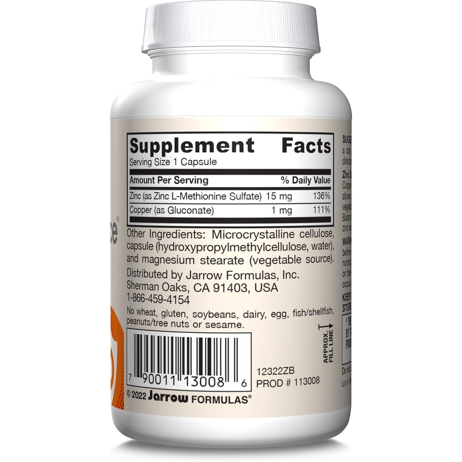 Product Description Jarrow Formulas Zinc Balance combines Zinc L-Methionine and Copper Gluconate in a 15:1 ratio. This blend is specially formulated to provide a 15:1 copper-zinc ratio. Each serving of Zinc Balance provides you with 15 mg of Zinc in the form of Zinc L-Methionine Sulfate and 1 mg of Copper. These amounts are carefully formulated to meet your body's needs and support the copper-zinc ratio.* Zinc Balance combines zinc L-methionine and copper gluconate. Zinc L-methionine allows zinc absorption with phytate and fiber in vegetables.* Zinc supports immune health.* Zinc Balance includes copper because supplemental zinc depletes copper.* Jarrow Formulas Zinc Balance is vegan, wheat free, gluten free, soy free, dairy free, egg free, fish/shellfish free, peanuts/tree nuts free, and sesame free , making it suitable for various dietary preferences. Adults take 1 capsule per day or every other day, preferably with food or as directed by your qualified healthcare professional. Jarrow Formulas� original goal has always remained the same: To design superior dietary supplements that help empower individuals to take charge of their own health.*These statements have not been evaluated by the Food and Drug Administration. This product is not intended to diagnose, treat, cure or prevent any disease. From the Manufacturer Zinc Balance is a synergistic combination of Zinc L-Monomethionine and Copper Gluconate in a 15:1 ratio. Zinc L-Monomethionine resists absorption interference from fiber and phytic acid. The mineral zinc promotes skeletal and immune health. Both zinc and copper are needed to promote super oxide dismutase (SOD) activity; which plays a critical role in the body's endogenous antioxidant network. Keep out of the reach of children.