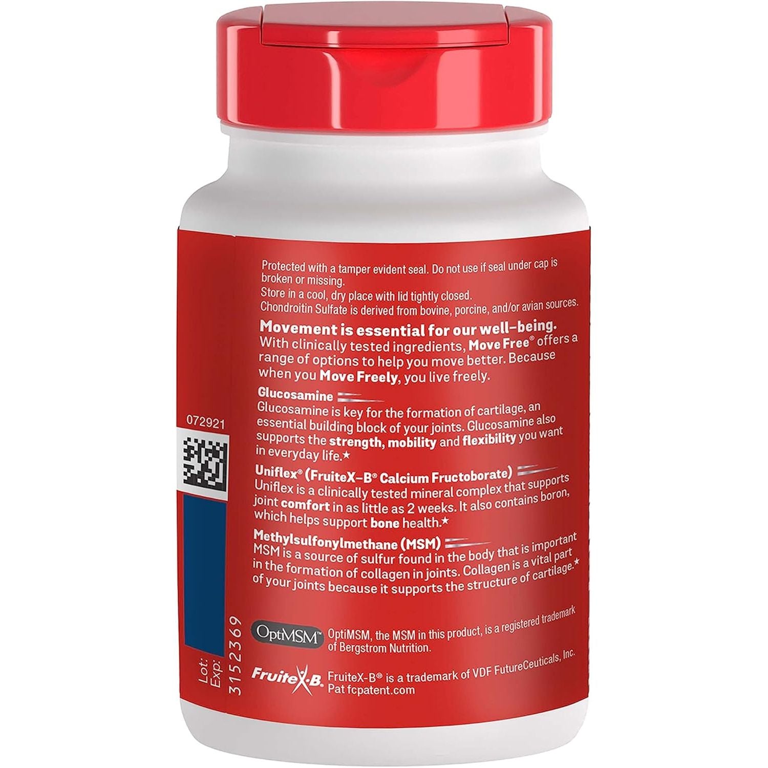 Move Free Advanced + MSM combines heritage joint support ingredients with the clinically studied mineral complex Uniflex. Uniflex has been shown to help support joint comfort in as little as 14 days.* Move Free Advanced + MSM contains Glucosamine, Chondroitin, Uniflex and MSM to help support joint mobility, comfort, strength, flexibility, and lubrication.* PLUS it provides extra cartilage support! WHY GLUCOSAMINE: Glucosamine is key for the formation of cartilage (essential building block of joints). Glucosamine helps contribute to healthy joint fluid that supports joint lubrication and smooth movement. It also supports the joint comfort, mobility and flexibility you want in everyday life. WHY CHONDROITIN: Chondroitin is a building block of cartilage that supports joint strength by helping to resist compression in the joints. In the body, Chondroitin functions by attracting fluid to joints to support cushioning and lubrication. WHY MSM: Methylsulfonylmethane (MSM) is a souce of sulfur found in the body that is important in the formation of collagen in joints. Collagen is a vital part of your joints because it supports the structure of cartilage. *These statements have not been evaluated by the Food and Drug Administration. This product is not intended to diagnose, treat, cure or prevent any disease.