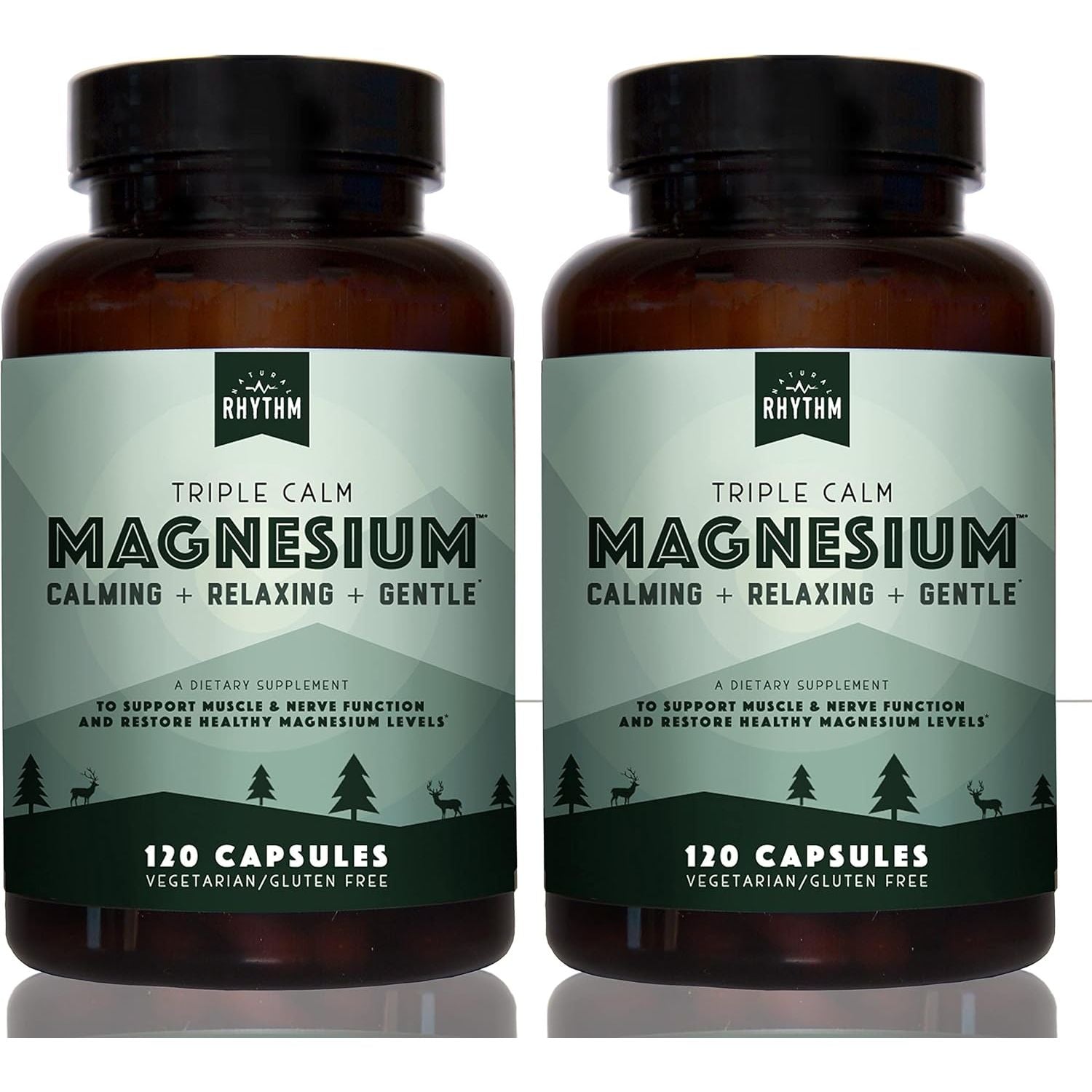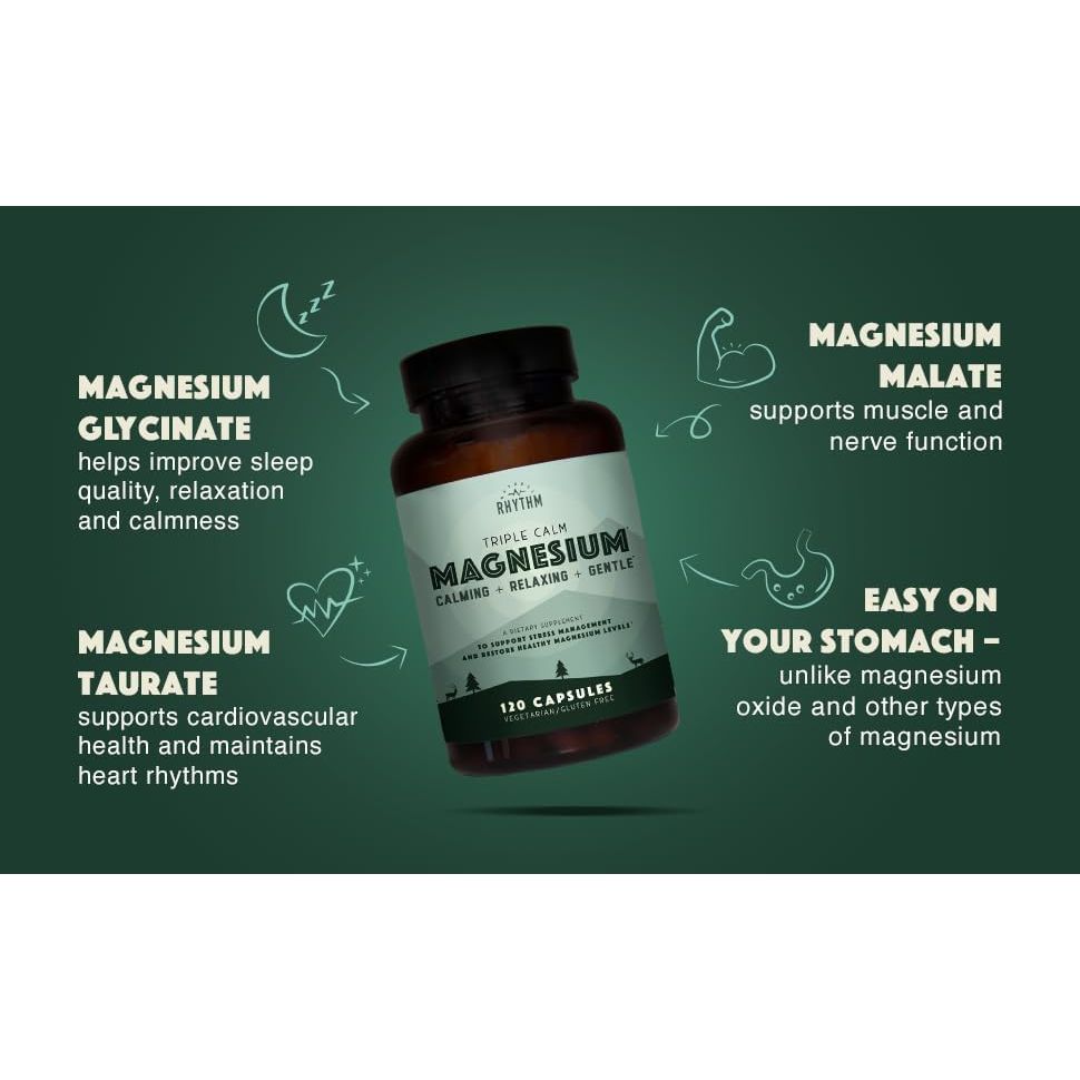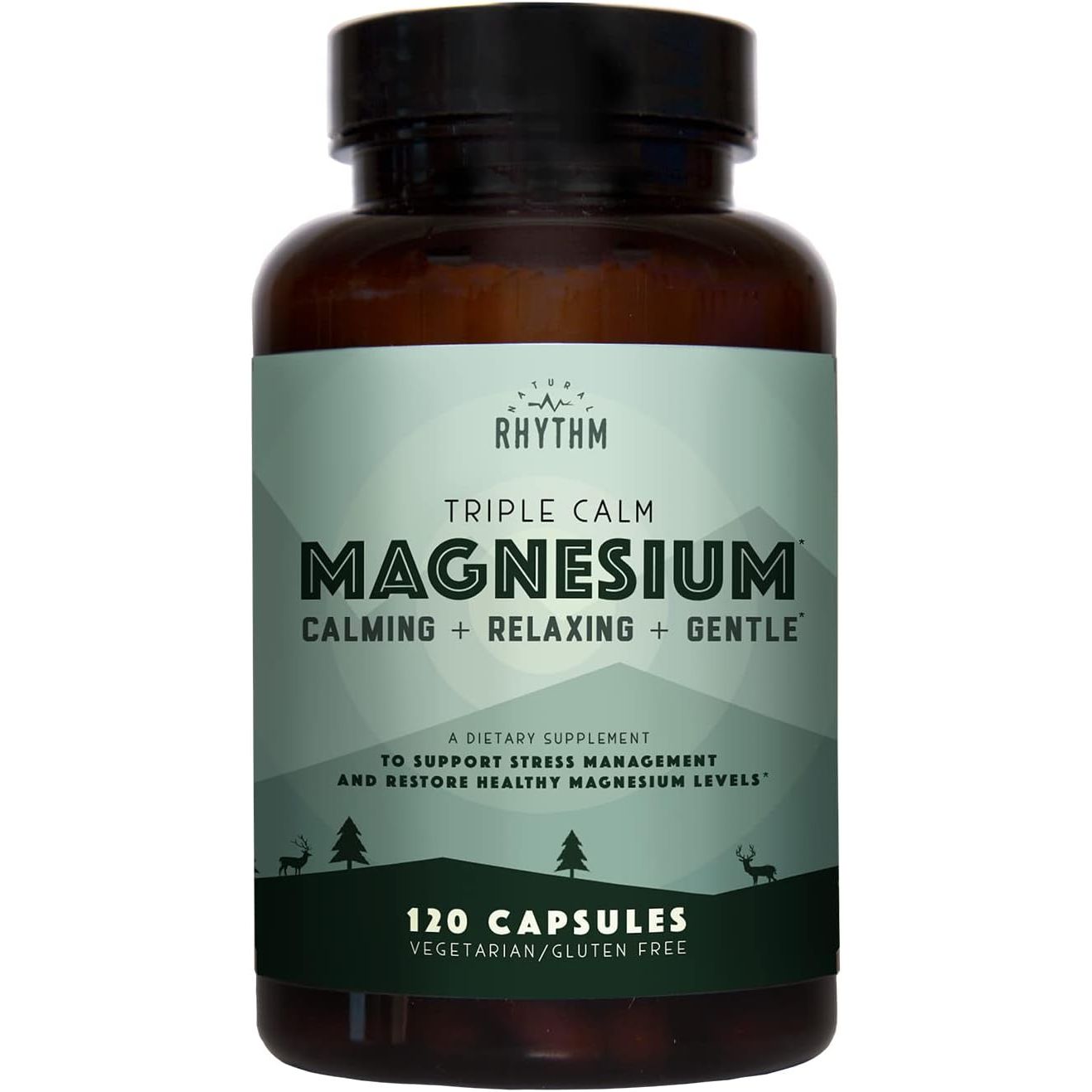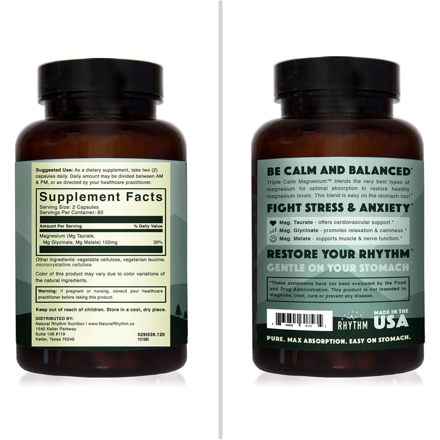 - Natural Rhythm Triple Calm Magnesium 150 mg - 120 Capsules – Magnesium Complex Compound Supplement with Magnesium Glycinate, Malate, and Taurate. Calming Blend for Promoting Rest and Relaxation.