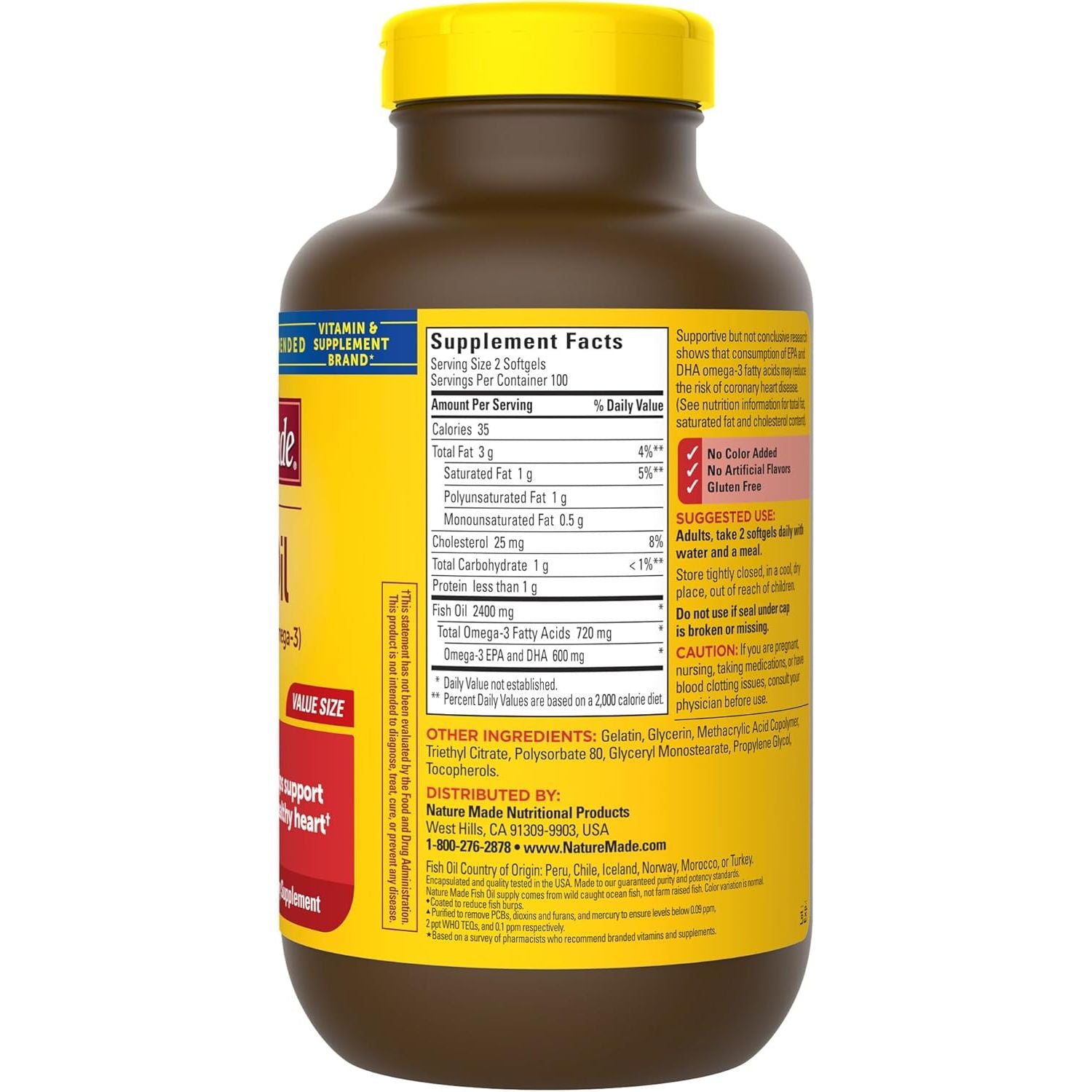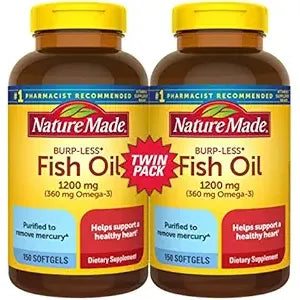 Product Description Nature Made Burp Less (3) Fish Oil 1200 mg provides 360 mg Omega-3 fatty acids per softgel to help support a healthy heart. A serving of two Nature Made Fish Oil Omega 3 softgels provides 2400 mg Fish Oil with 720 mg Omega 3s (600 mg EPA and DHA). These gluten free Nature Made Fish Oil 1200 mg softgels have no color added and no artificial flavors. Nature Made burp less fish oil supplements for women and men are purified to remove mercury (2) from wild-caught ocean fish, not farm-raised fish. Adults, take two of these Omega 3 Fish Oil softgels daily with water and a meal. An Omega 3 supplement like fish oil Nature Made can help provide Omega 3 Fish Oil for men and women. Nature Made DHA EPA Omega 3 supplements are quality you can trust. (2)Purified to remove PCBs, dioxins and furans, and mercury to ensure levels below 0.09 ppm, 2 ppt WHO TEQs, and 0.1 ppm respectively. (3)Coated to reduce fish burps. *Based on a survey of pharmacists who recommend branded vitamins and supplements. Brand Story By
