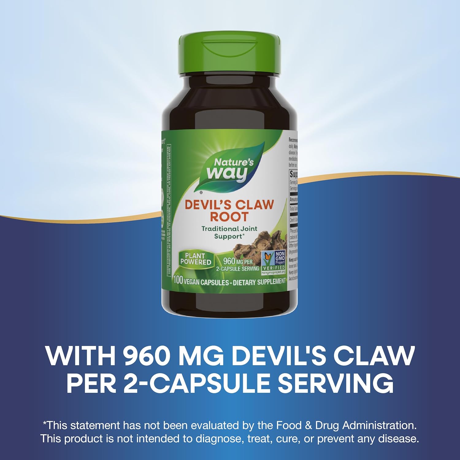 Nature's Way Devil's Claw Root provides traditional joint support.* With 960 mg of devil's claw (tuber) per 2-capsule serving.